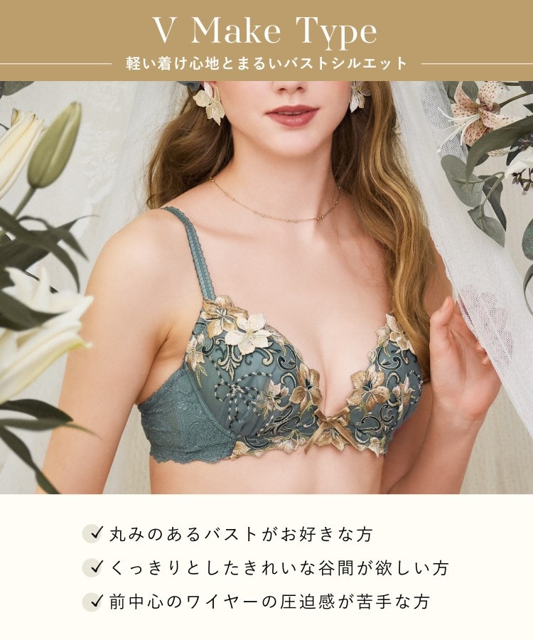 前中心が低いワイヤーとカップのサイドパネルで、バストを中央に寄せて美しいV字を演出します。カップは4枚接ぎ構造でよりバストにフィットし、やさしい着け心地のパターンです。