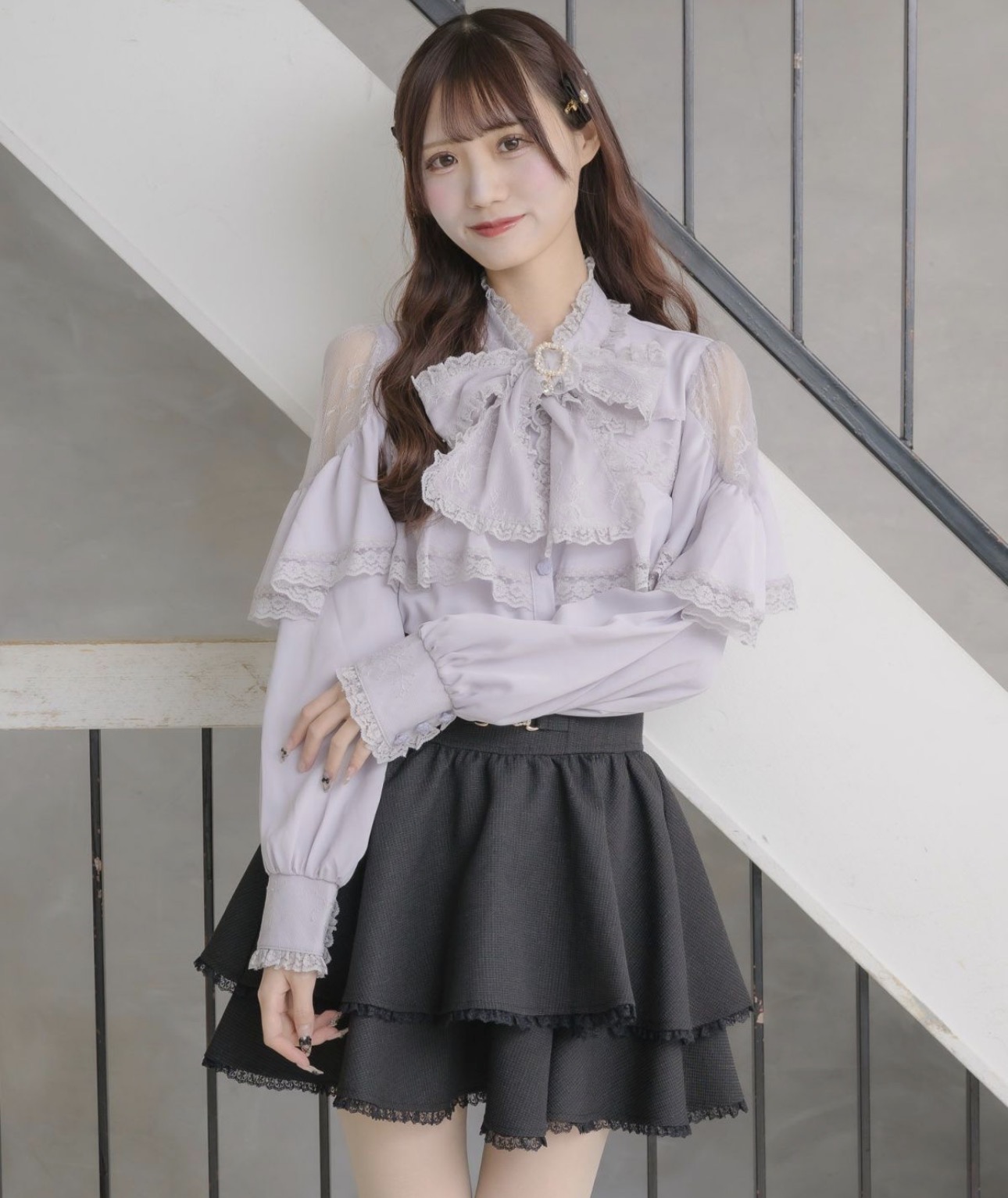 繊細なレースを重ねたボウタイがクラシカルな印象を添えるラッフルブラウス。カフスにもレースをあしらい、上品なバラ釦が手元に華やかさをプラスします。肩からふんわりと流れるケープ風デザインが、動くたびに優雅なシルエットを演出。可憐さと上品さを兼ね備えた、お姉様ガーリースタイルを叶える一枚です。
