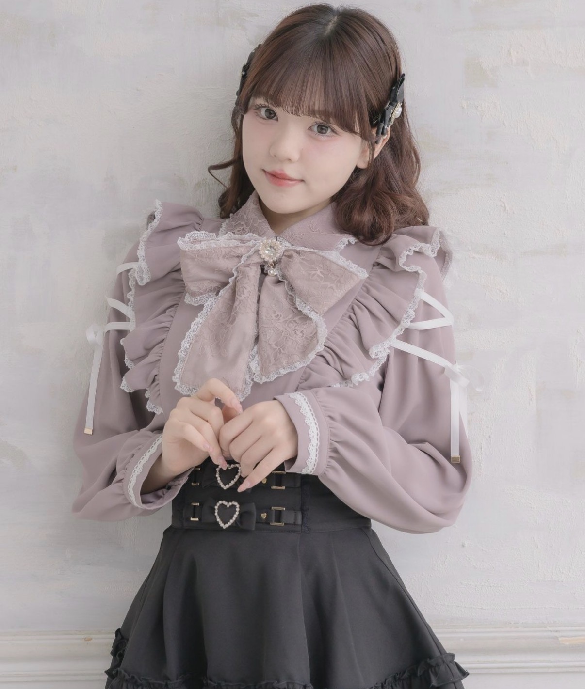 首元には大きめなリボンをあしらい、スリーブにはレースアップを施して、フェミニンムードにほどよいスパイスをプラス。ハート型のボタンや繊細なレース使いが、ROJITAらしい上品な可愛さを引き立てます。一枚でしっかり映えるデザインだから、これからの季節の主役トップスに♡