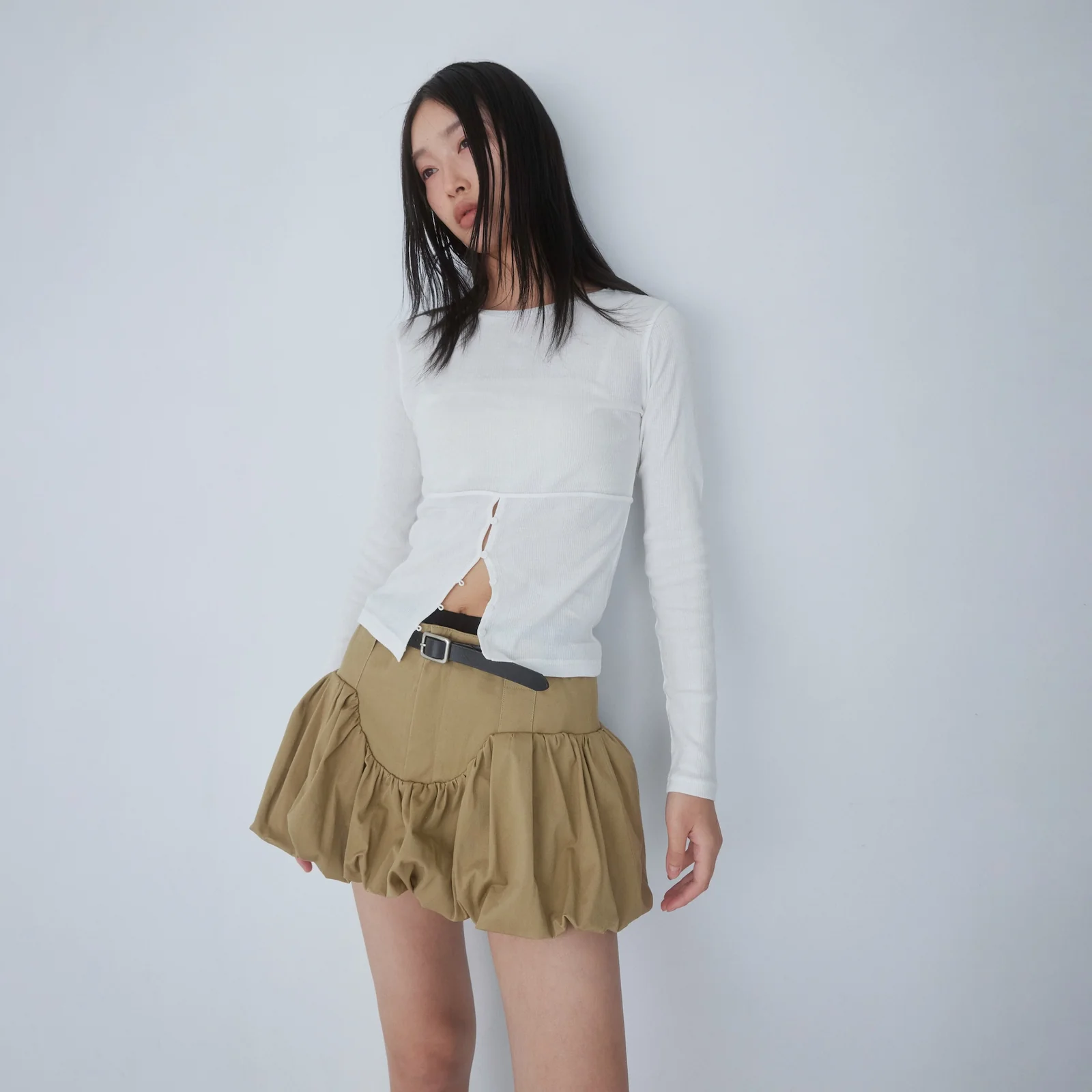 バスト下から切り替えを入れ、開閉可能なボタンをあしらったコルセット風デザイン。切り替え部分はパイピング仕様にすることで強調され、スタイルアップ効果に繋がります。ボタンを開けてキャミソールやインナーのカラーを覗かせるスタイリングもおすすめです。