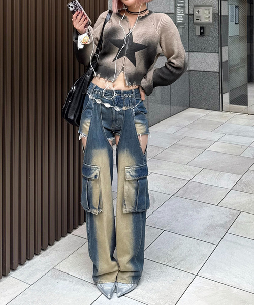 フロントにはスター(★)プリントをあしらい、スプレー加工と裾のダメージでグランジ感を演出。