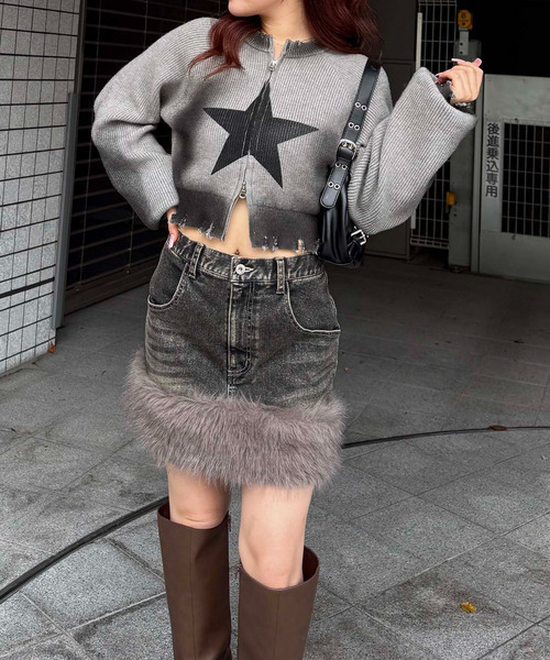 ショート丈のニットトップスにボリューム袖が存在感をプラス。