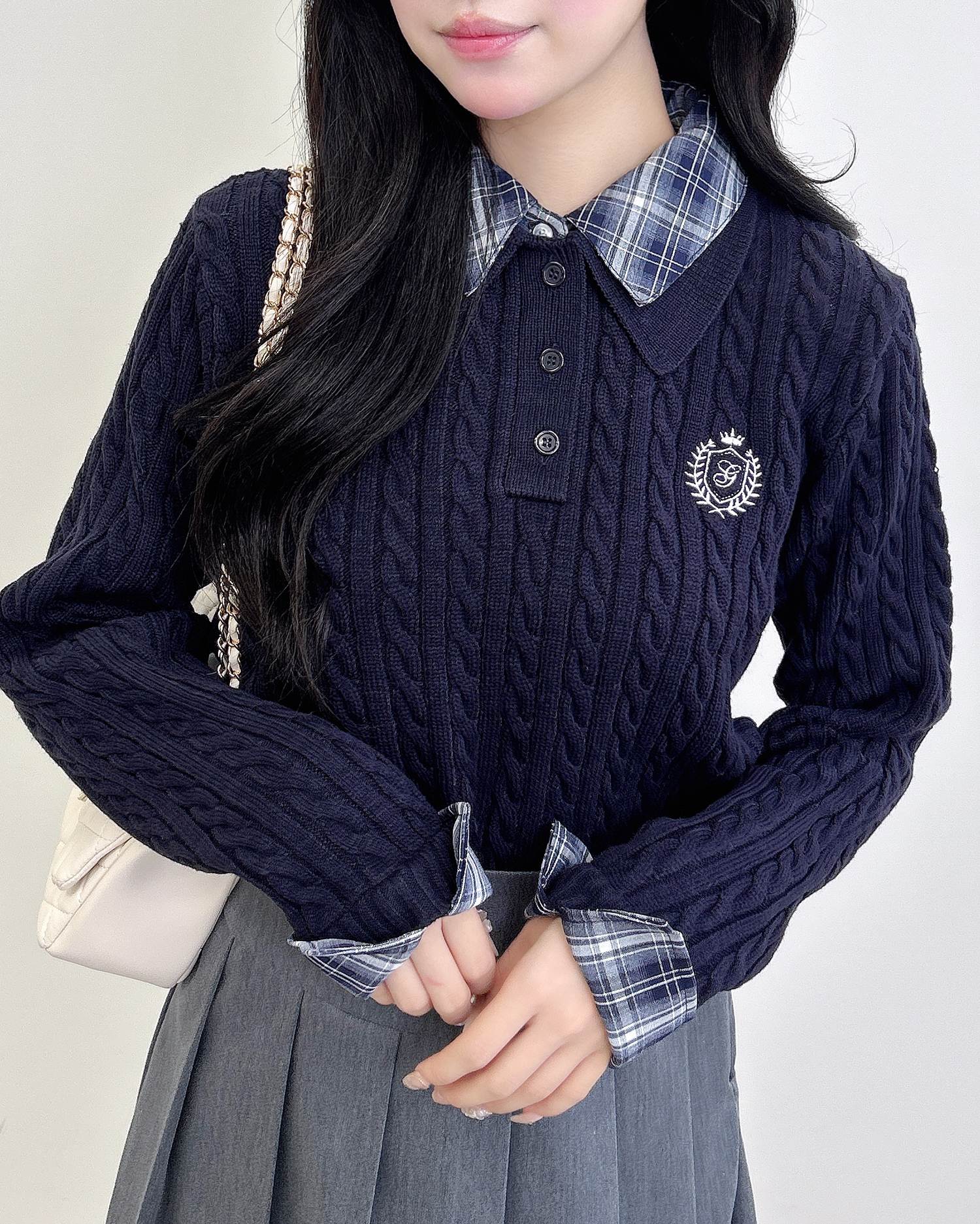 1254-900243 ダブルカラーチェック柄シャツドッキングポロニット