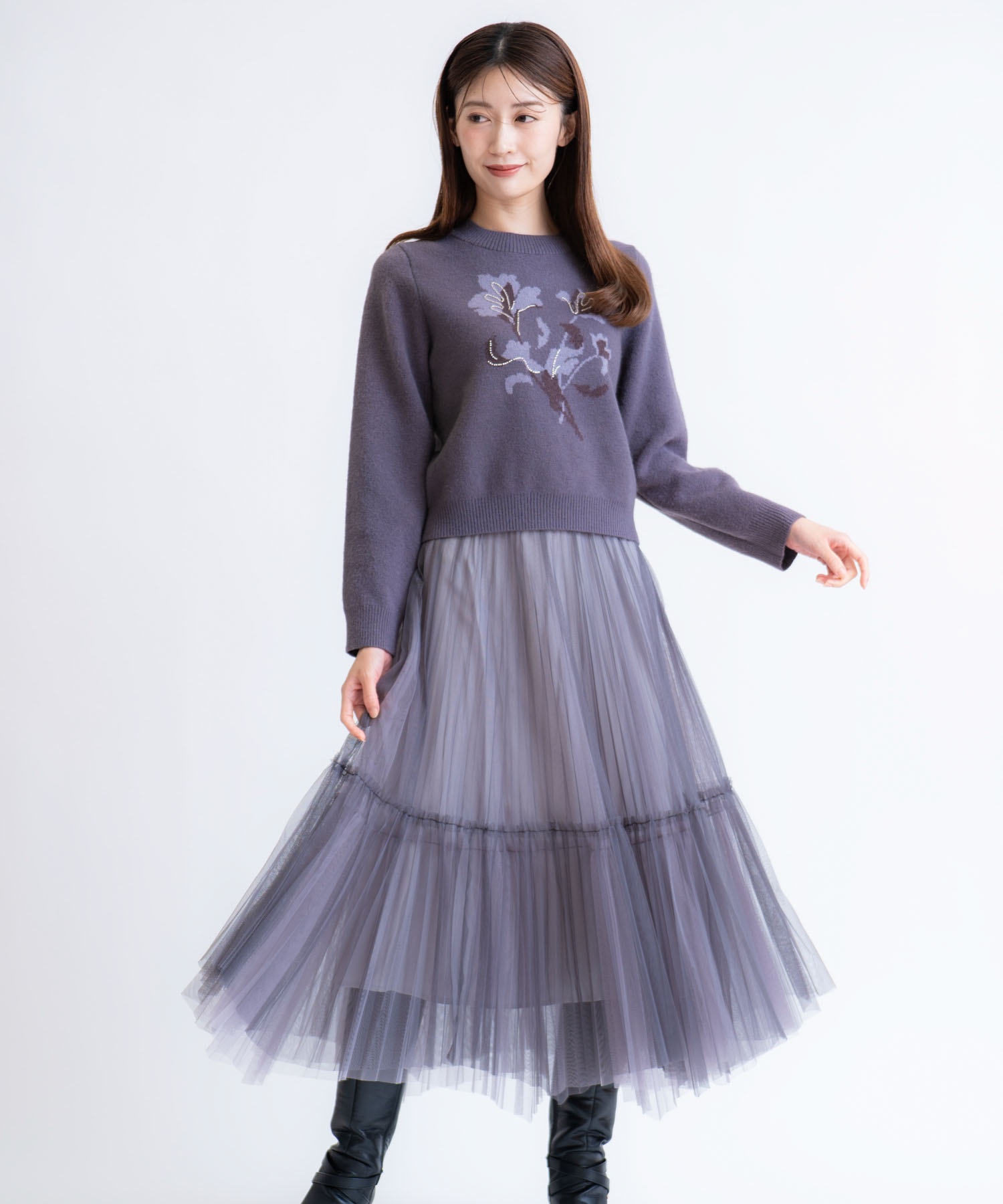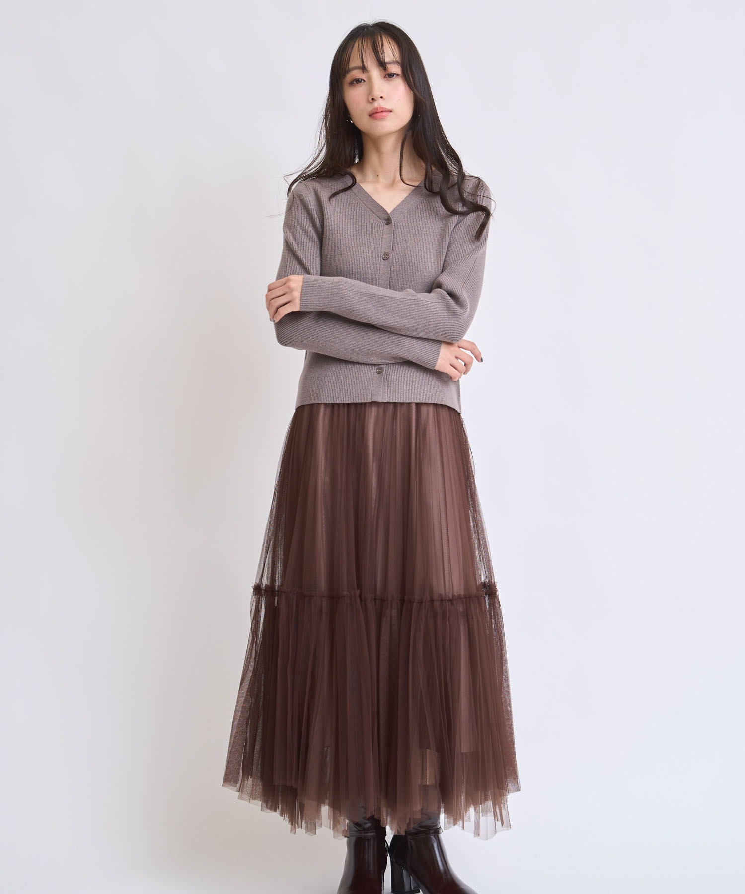 カラーの異なるチュールを2枚重ねた、軽やかなイレヘムデザインのスカート。繊細に揺れるプリーツが動きに表情を与え、女性らしい優雅な印象に。透け感のあるチュールが奥行きを生み、コーデに品のある華やかさをプラスします。ニットやブラウスとも好相性で、デイリーからお出かけまで活躍します。