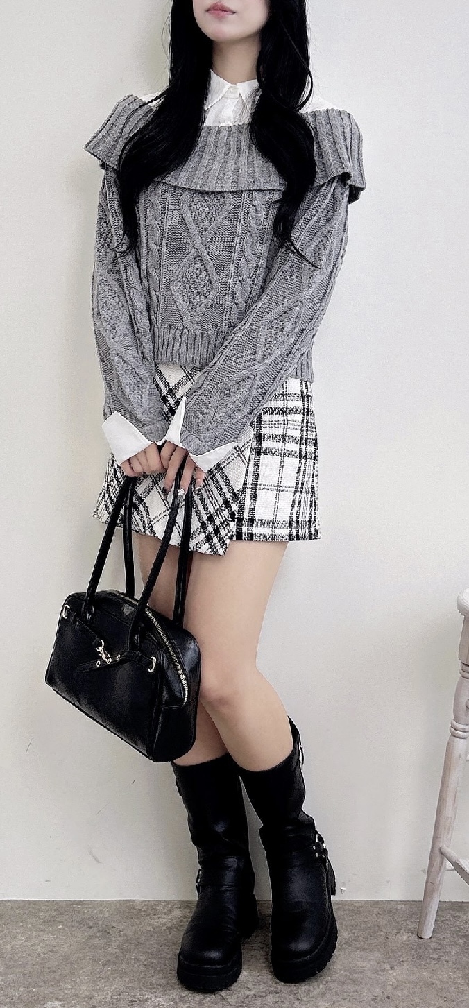 ケーブル編みオフショルニットの首元と袖部分にシャツがレイヤードされたデザインです🫧🎀