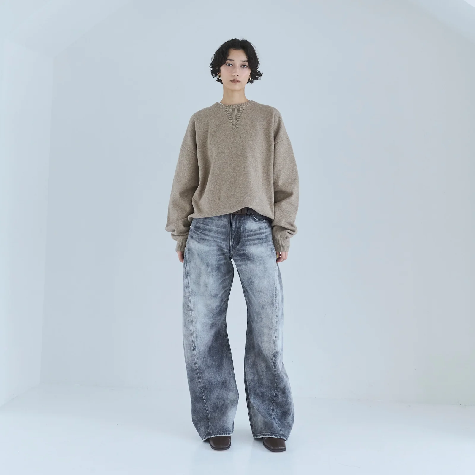 立体的なパターンを採用し、ツイストを加えた独特のラインが特徴。着用時に自然にシワが入り、こなれた立体感を演出します。SeaRoomlynn既存のデニムよりも股上を約4cm浅く設定し、腰まわりがすっきり見える設計に。ウエストラインは フィットし、裾にかけて程よく広がるソフトワイドシルエットです。