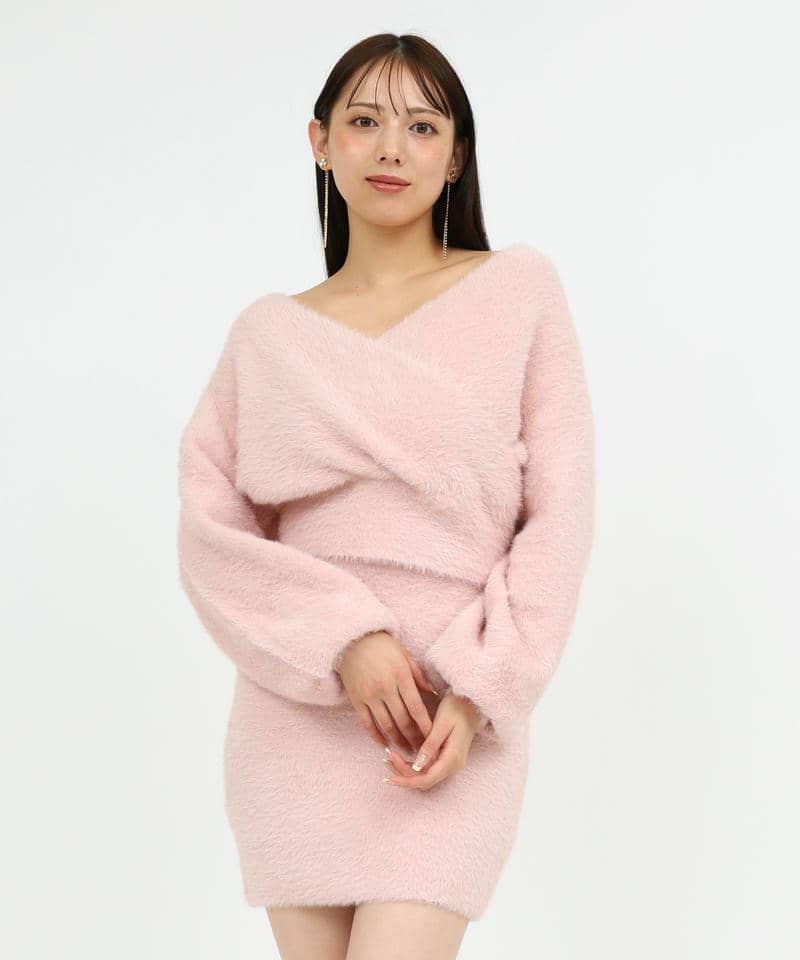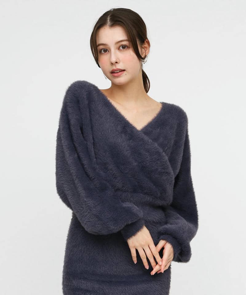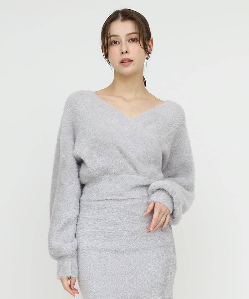 ふんわりとしたシャギーニットで仕立てたカシュクールデザインのトップス。