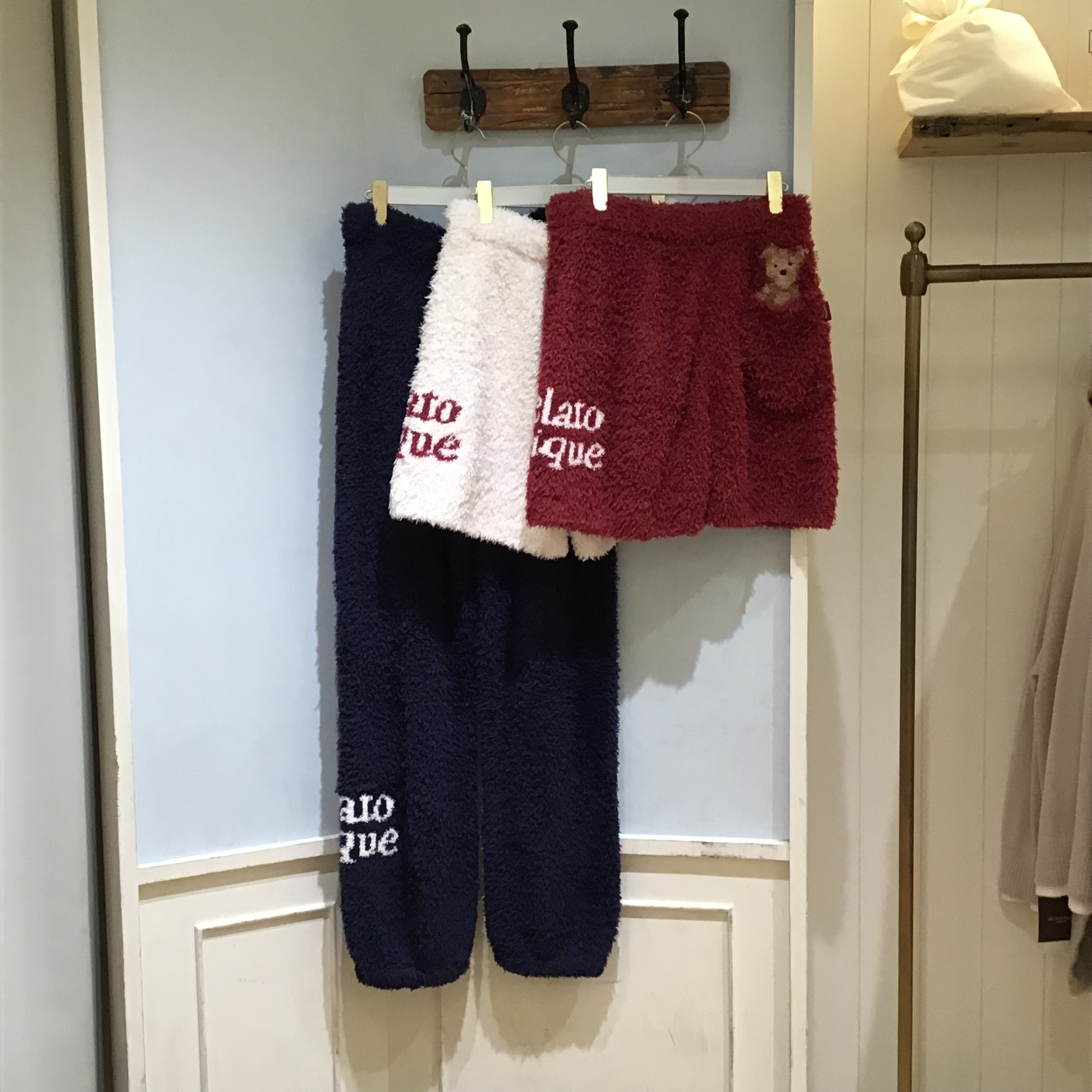 毛足の長い‘ジェラート’素材を使用した短すぎないシルエット。左裾にシリーズ共通のロゴジャガードを大きく入れました。右後ろポケットの中から、ベアがひょっこり覗く愛嬌たっぷりのデザインがポイントです。色はアイボリーとレッド、ネイビーの3色展開🧸✨