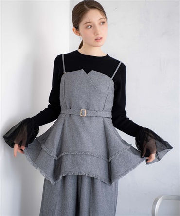 イレヘムシルエットとフリンジが目を引く、デザイン性の高いビスチェ。
