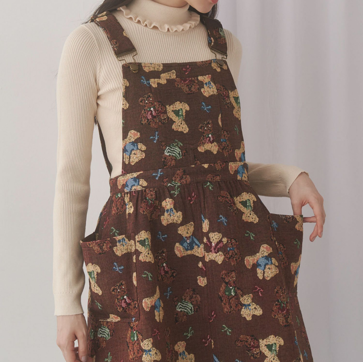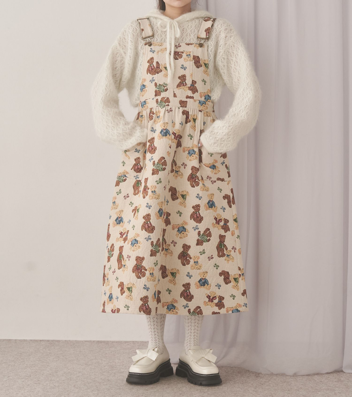 たっぷりくまさんたちが楽しげな、愛らしいジャガード生地のジャンパースカート。