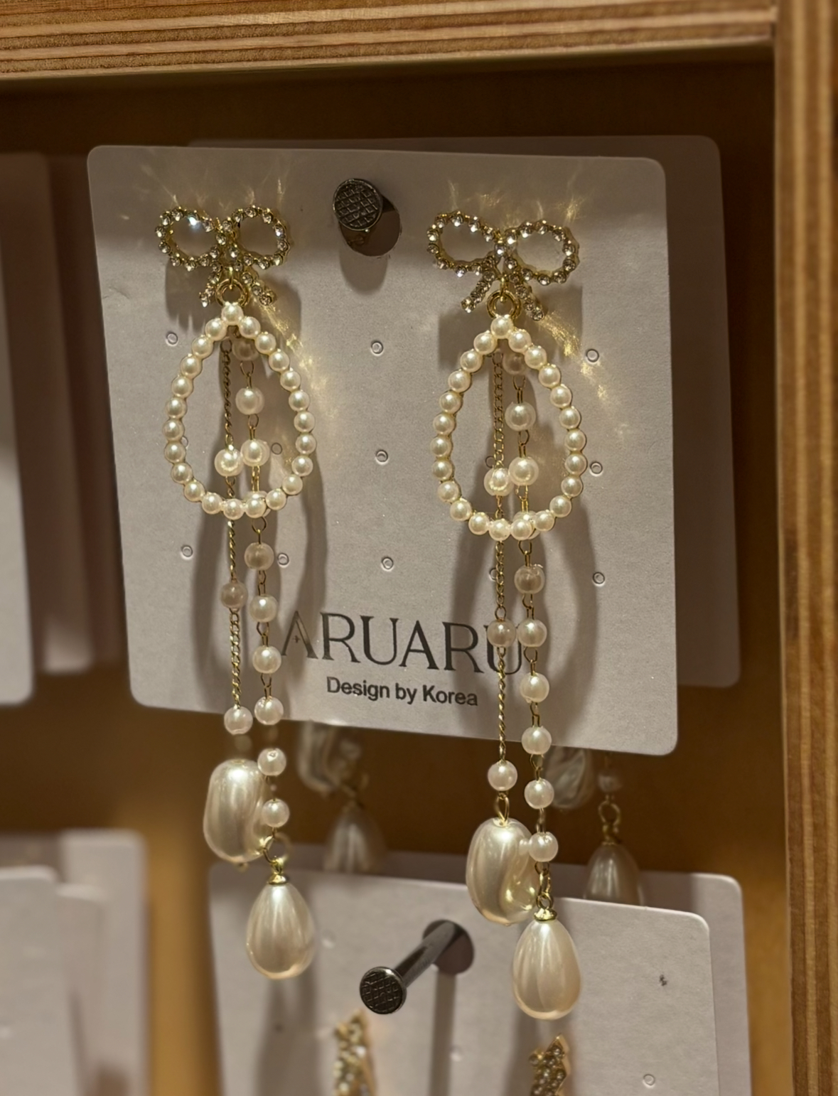 きらめくストーンリボンをトップに、しずく型に連なるパールが上品に揺れるロングデザイン✨