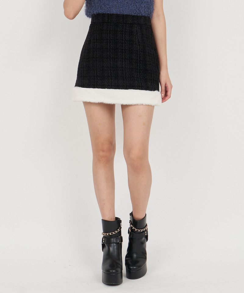クラシカルなツイード素材に、ふわりとしたファーを裾にあしらったミニスカート。