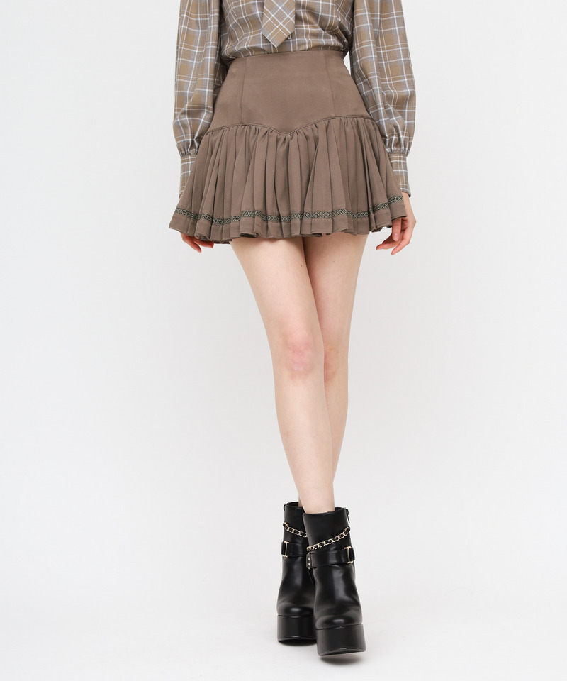 ミドルヒップから切り替えを入れ、細かいプリーツで女性らしい動きを演出します。