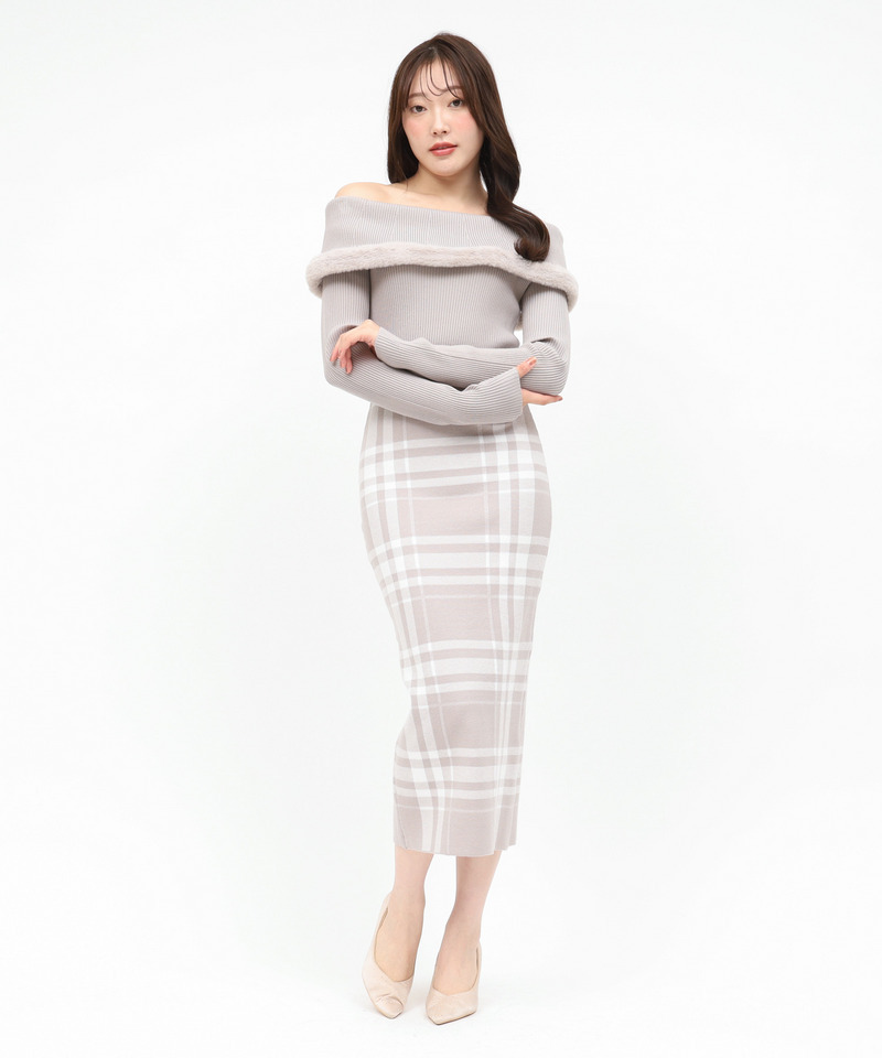 存在感溢れるチェックジャガードが目を惹くオフショルニットワンピース。