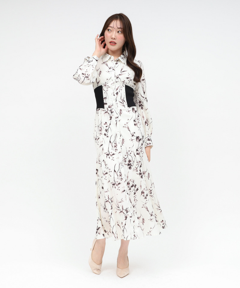 シンプルながらもひと目で大人の女性らしさが際立つ、花柄×シャツ襟の上品デザインが魅力のマーメイドワンピース。
