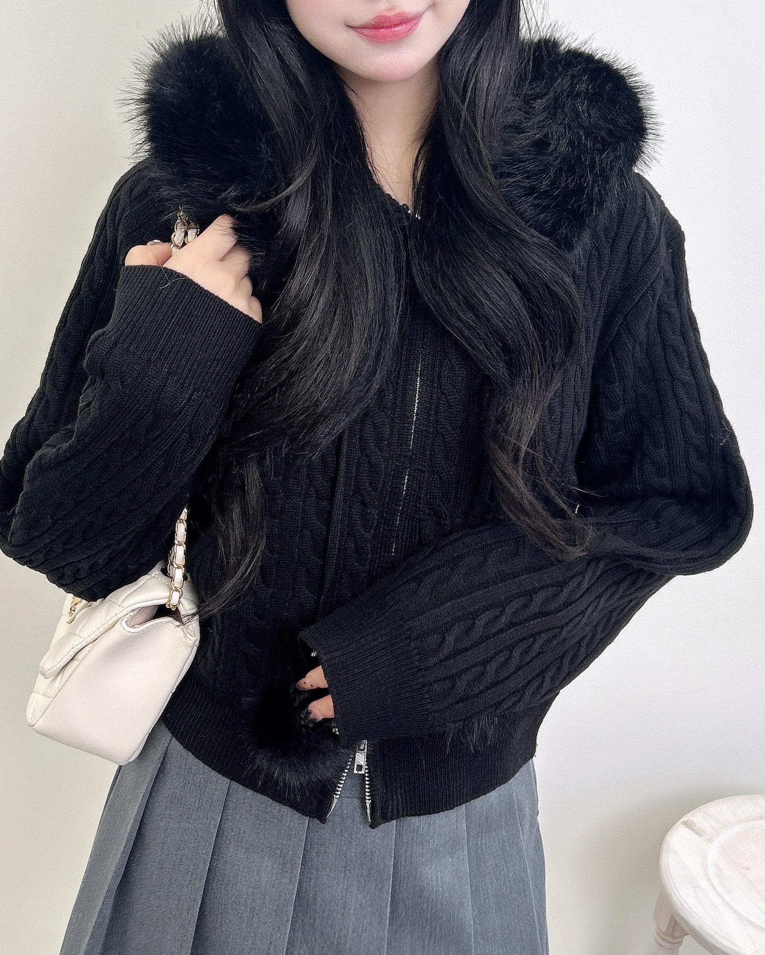 1254-600299 ポンポン付フェイクファーケーブルニットパーカー