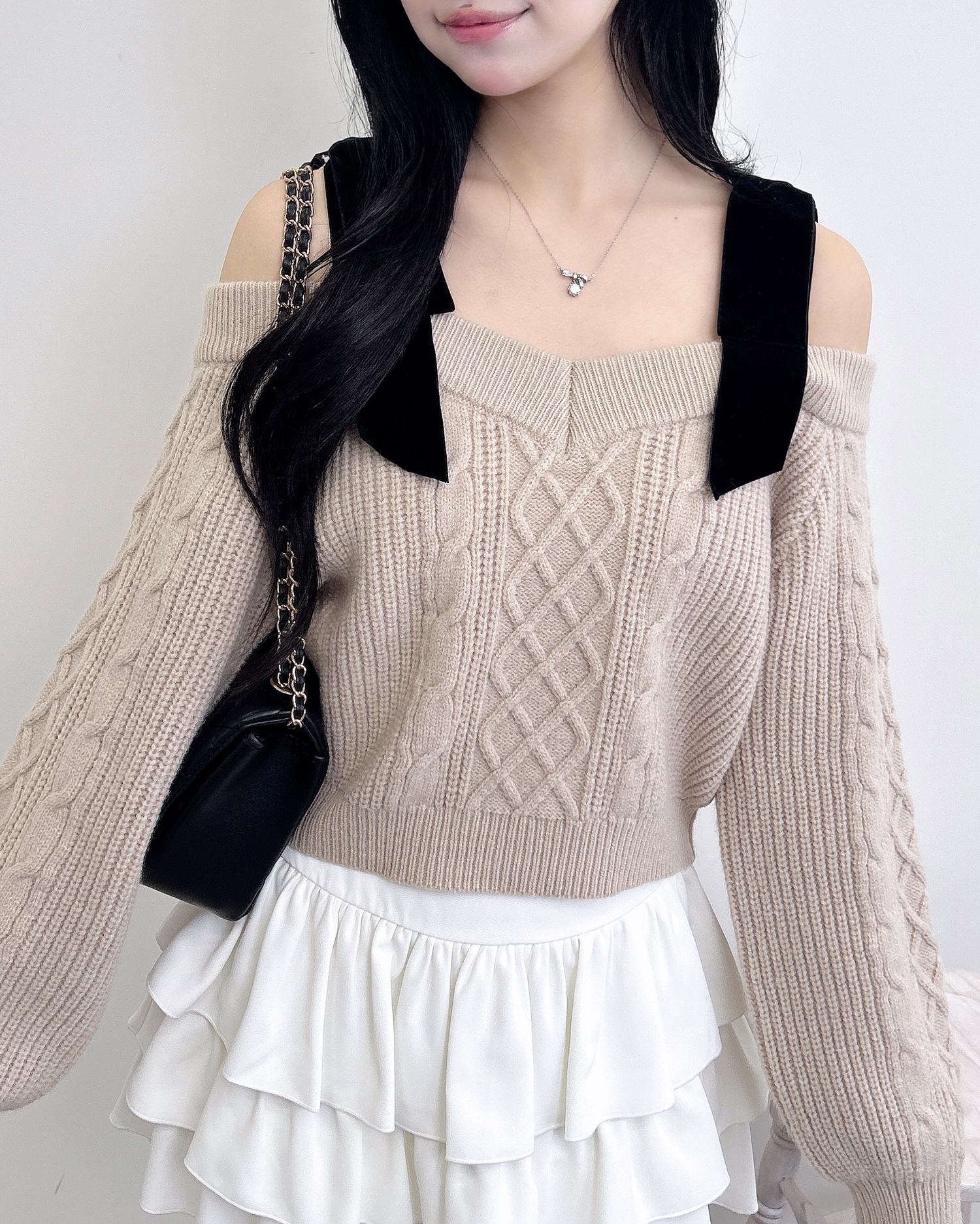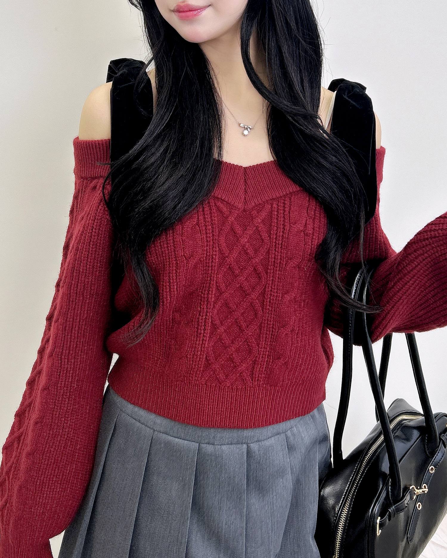 1254-900296 2Wayベロアリボンオフショルケーブルニット