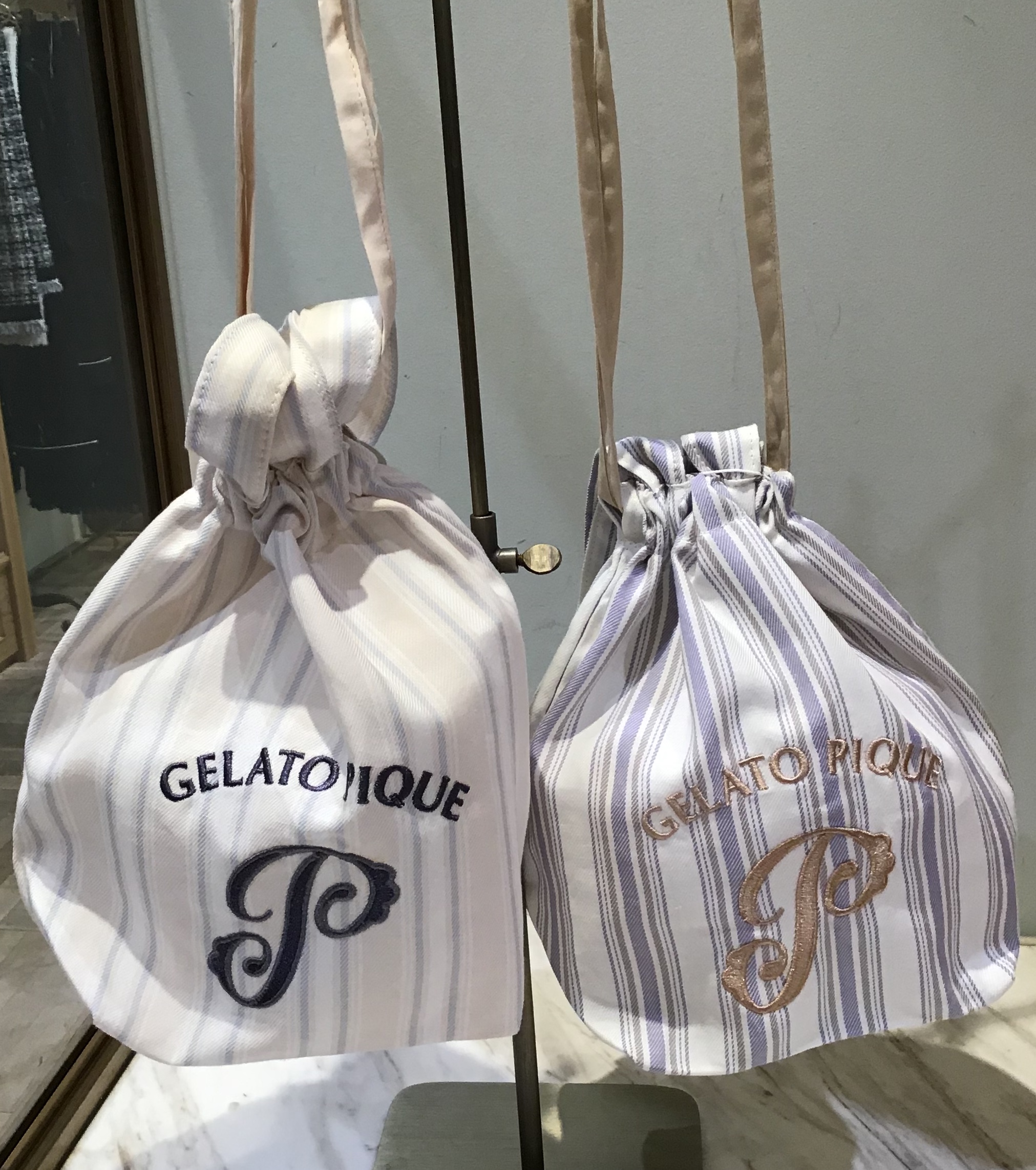 柔らかな配色の先染めストライプ生地を使用した巾着ポーチ!