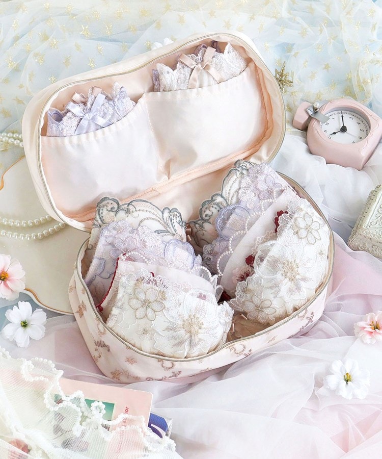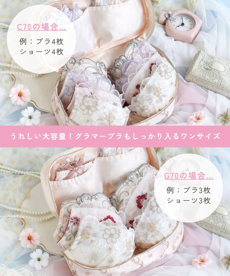サテン地の大ぶりなリボンには輝くビジューを添えて、高級感のあるデザインに。両開きのファスナーにはリサマリロゴをあしらいました。2つの内ポケットや幅広の持ち手なども、こだわりのポイントです。巾着ポーチはちょっとした小物入れにも使いやすいサイズで、ランジェリーポーチとセットでご使用いただけます。480「ホリー」シリーズとお揃いのレースを使用しているため、セットでお使いいただだくのもおすすめです。旅先や帰省など、様々なシーンに合わせてリサマリのランジェリーをお楽しみください。