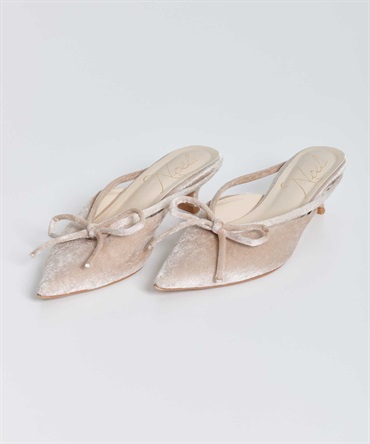 上品な光沢のあるベロア素材と甲のリボンモチーフがポイントの低めヒールのミュール。 さっと履ける気軽さと、きちんと感のあるシルエットのバランスが絶妙です。