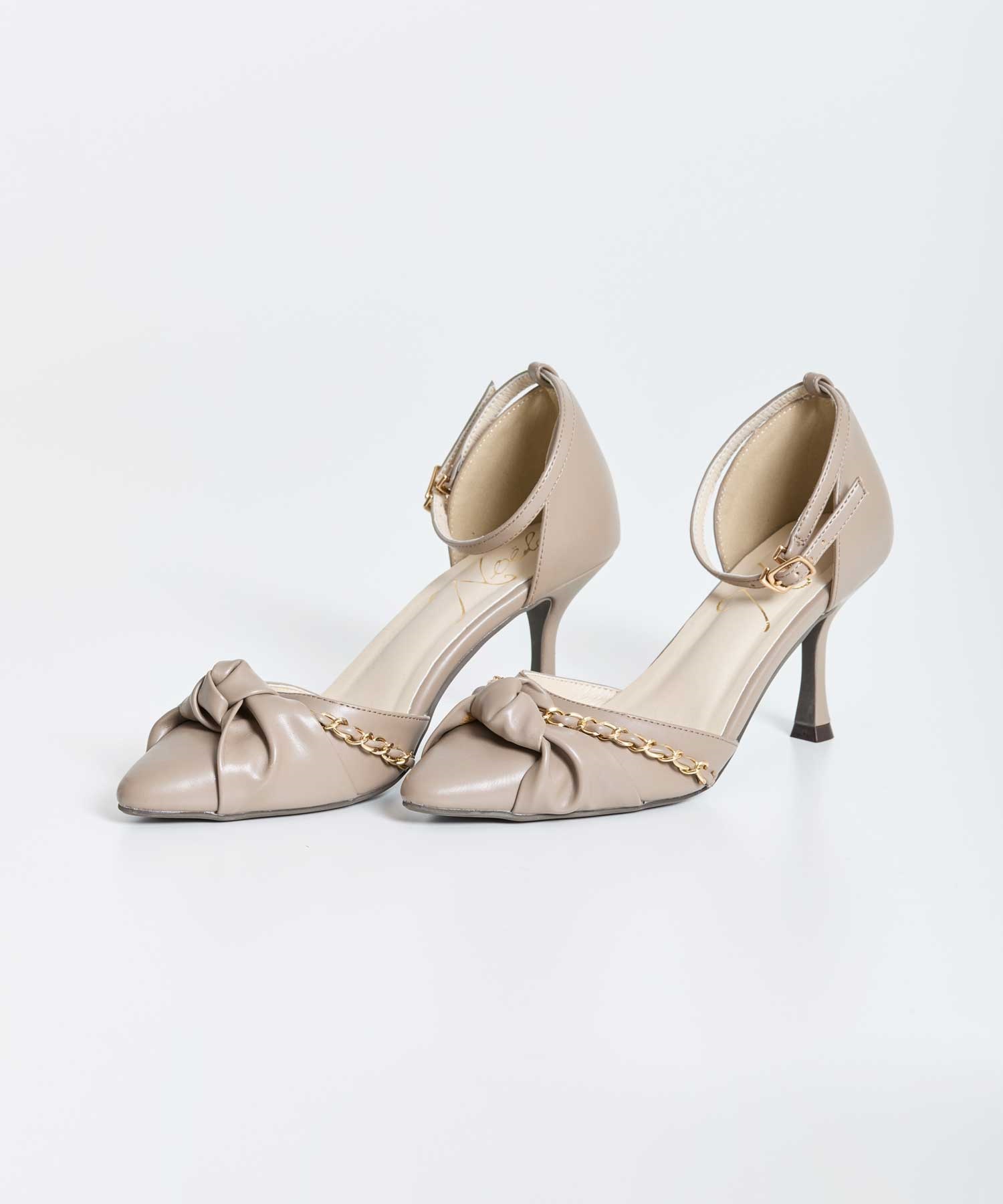 つま先には、リボンのように結ばれたノットモチーフ。その結び目に通されたチェーンディテールが、クラシックさと少しのモード感を添えます。