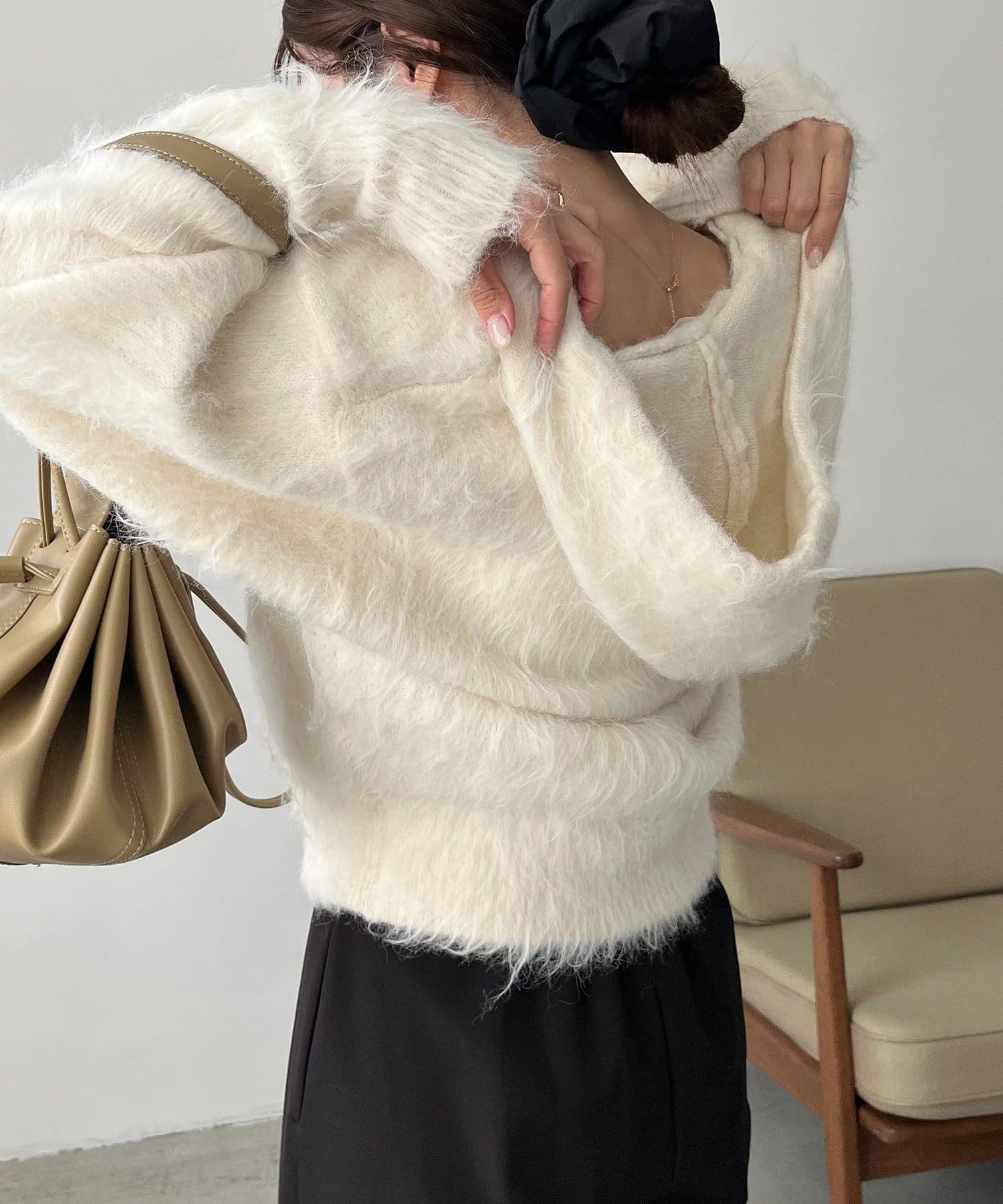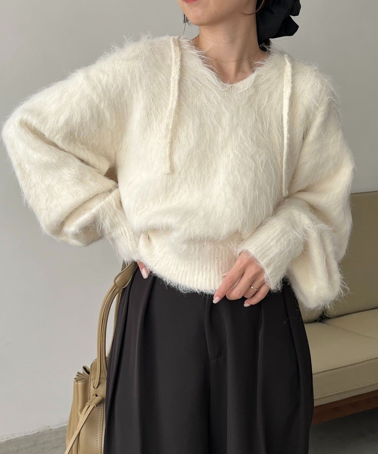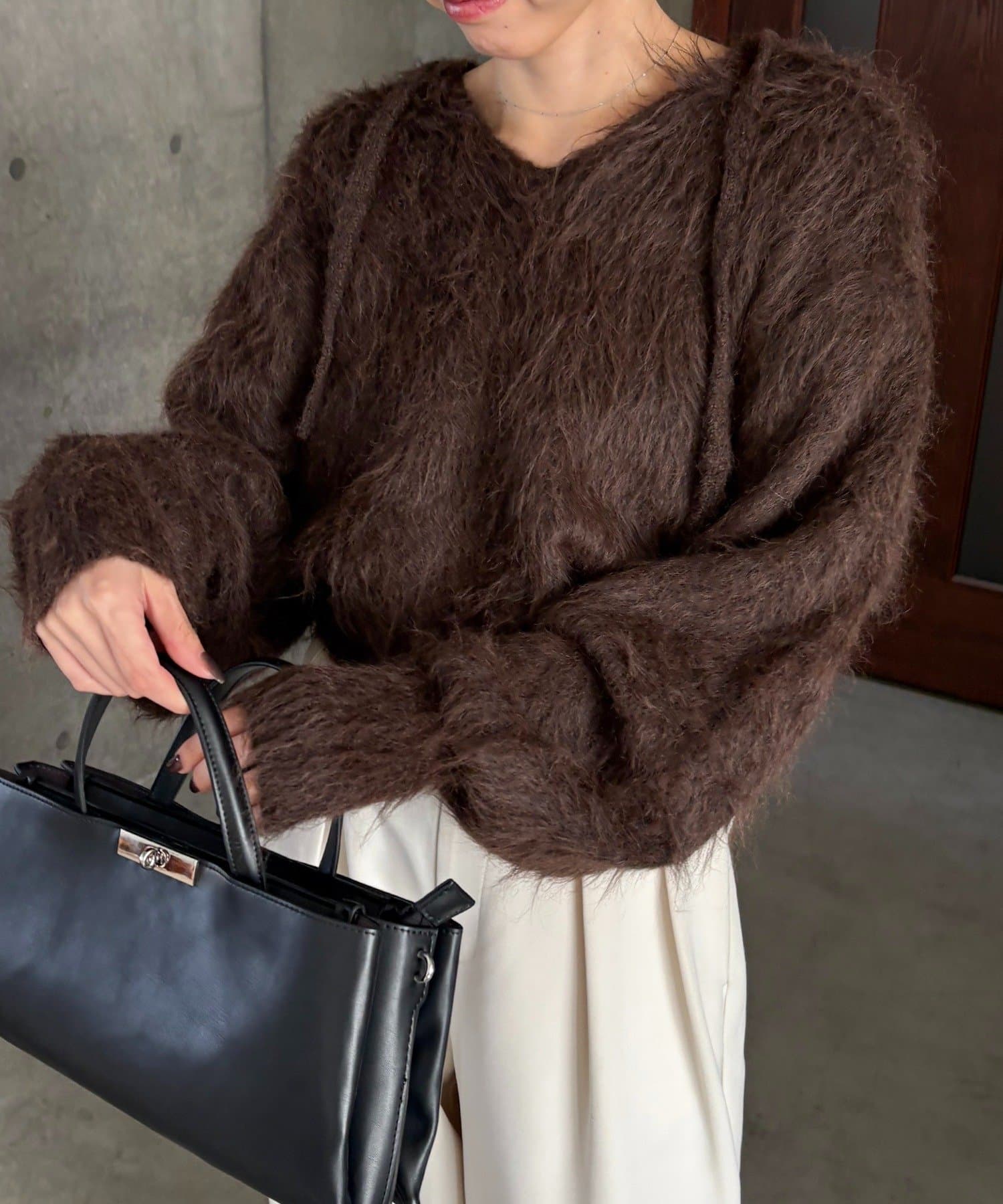 シャギーニットにフードが付いているデザインは珍しく被りにくいので個性を出したい方におすすめ✔️