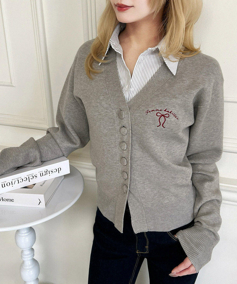 胸元に施された配色ロゴ&リボン刺しゅうがポイントの女性らしいVネックニットカーデトップス。