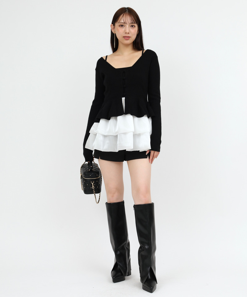 上品な光沢感のあるシアー生地をドッキングしたキャミソール×女性らしいペプラムデザインが魅力のニットカーディガンのアンサンブル。