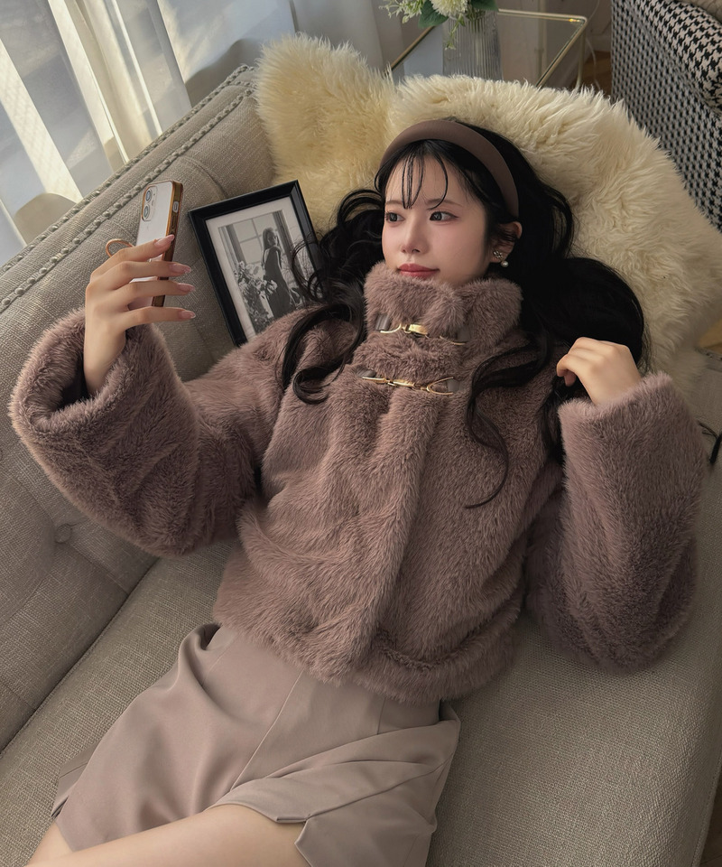 ふわふわの質感が魅力のスタンドカラーファージャケット。