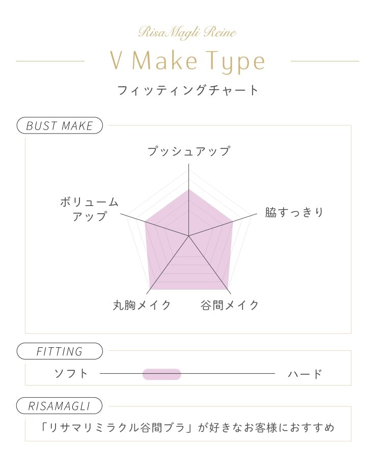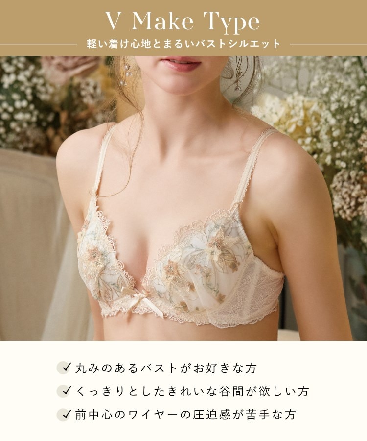 前中心が低いワイヤーとカップのサイドパネルで、バストを中央に寄せて美しいV字を演出します。カップは4枚接ぎ構造でよりバストにフィットし、やさしい着け心地のパターンです。