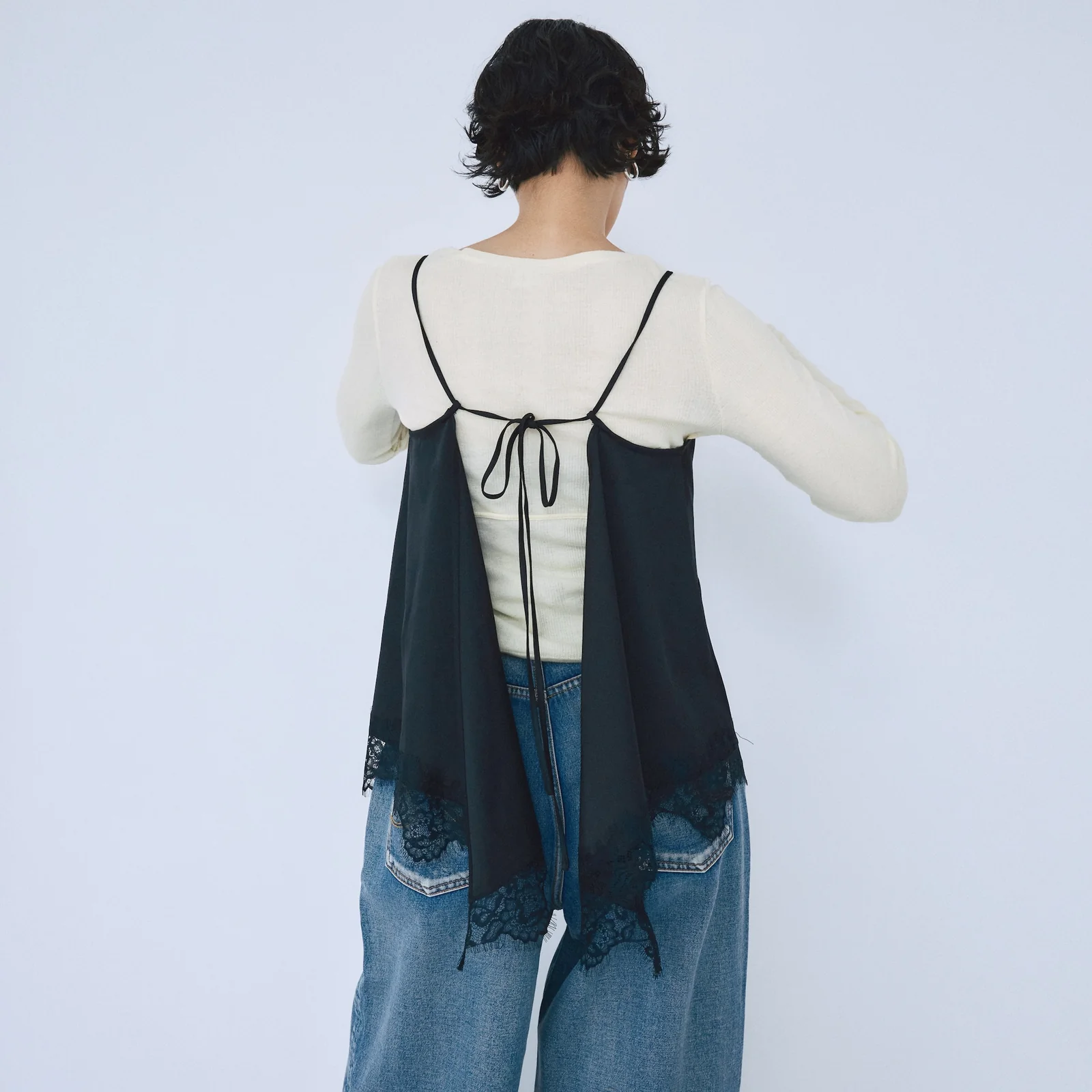 エプロンのように開いたバックオープン仕様で、レイヤードした時にも抜け感をプラス。センターバックで結ぶタイプの5mm幅の華奢なストラップは、長さ調節も自由にできます。