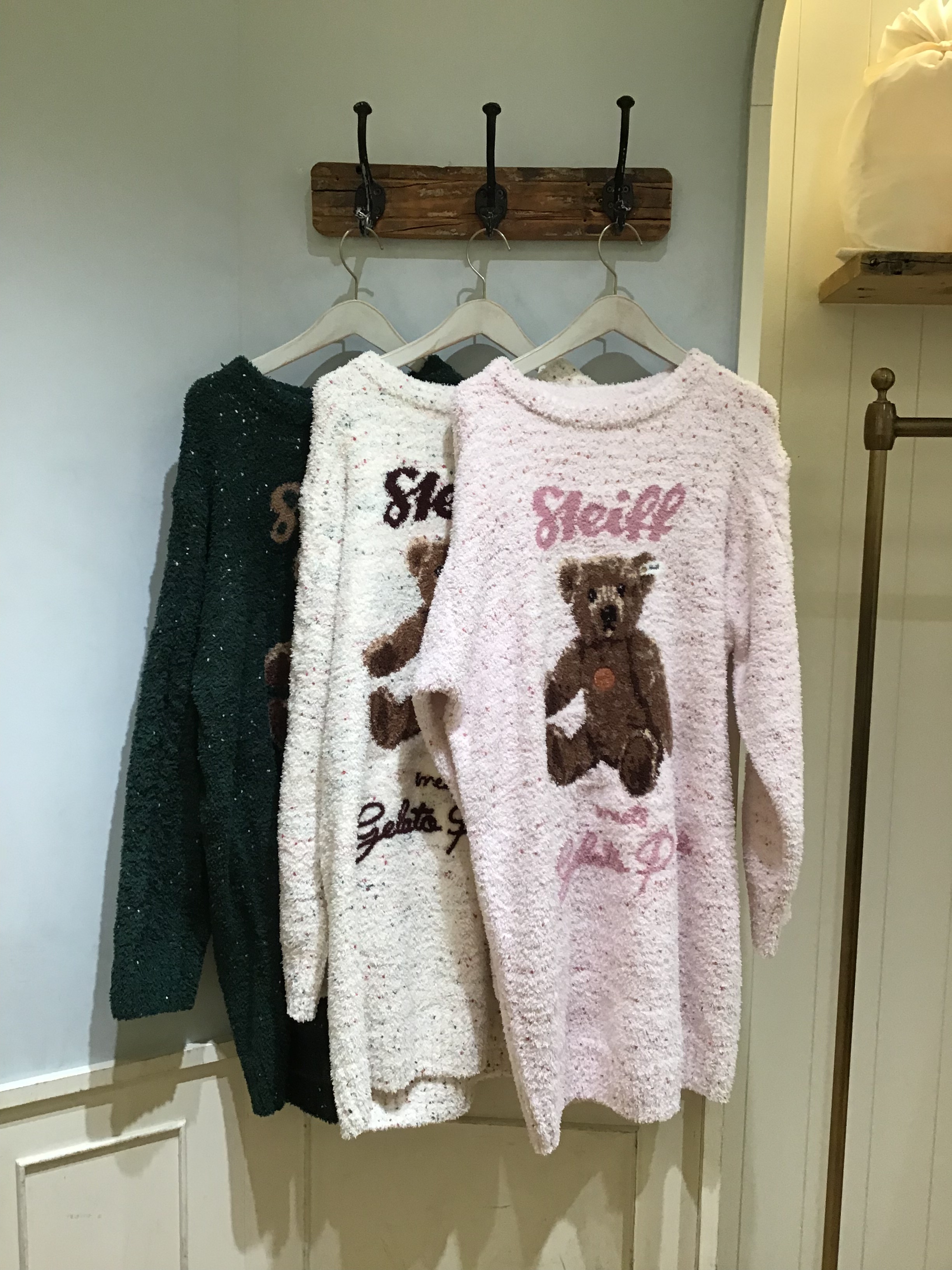 クリスマスの甘いお菓子をイメージした、カラーネップ入りの’パウダー’素材のジャガードワンピースです🎀長すぎない丈感で、ロングソックスやレギンスなどを合わせて可愛く着こなせるシルエット。1902年にSteiffが生み出した世界で最初のテディベア『55PB』をフロントに描き、袖にはアラン柄をあしらいました。粉砂糖のようなパウダリータッチと、ゆったりとした着心地に包まれます🧶