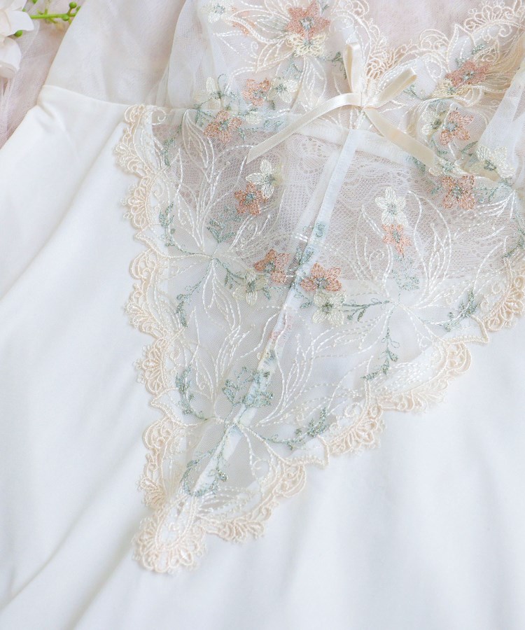 可憐に咲くアベリアのお花をイメージしたシリーズです。レースにはラフなステッチで大胆に描いたアベリアと小花を刺繍して、その上からお揃いのチュールアップリケをあしらうことで、奥行きのある繊細な仕上がりに。さらにツイード風の網目模様をほどこした小花のアップリケを重ねて、キラキラと輝くラメ糸とワンポイントのカラーリングが、お花がふわっと浮き出ている様子を可愛らしく表現しています。カップ上辺には幾何学模様を立体的なインケミ手法でほどこして、エレガントな美しさに。前身頃にはお揃いの刺繍レースを、バックスタイルにはストレッチレースをふんだんにあしらい、360度どこから見てもこだわりを詰め込んだ豪華なスタイルが完成しました。両サイドにはスリットとアップリケを添えて、動くたびにひらひらと揺れる裾が女性らしさを演出します。色展開も冬の空気に溶け込むような、やわらかく上品な雰囲気を醸し出すコレクションです。