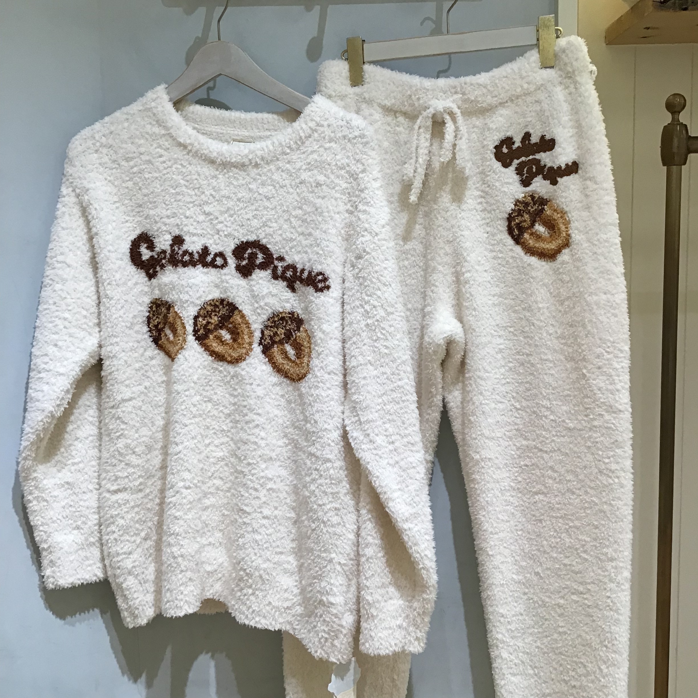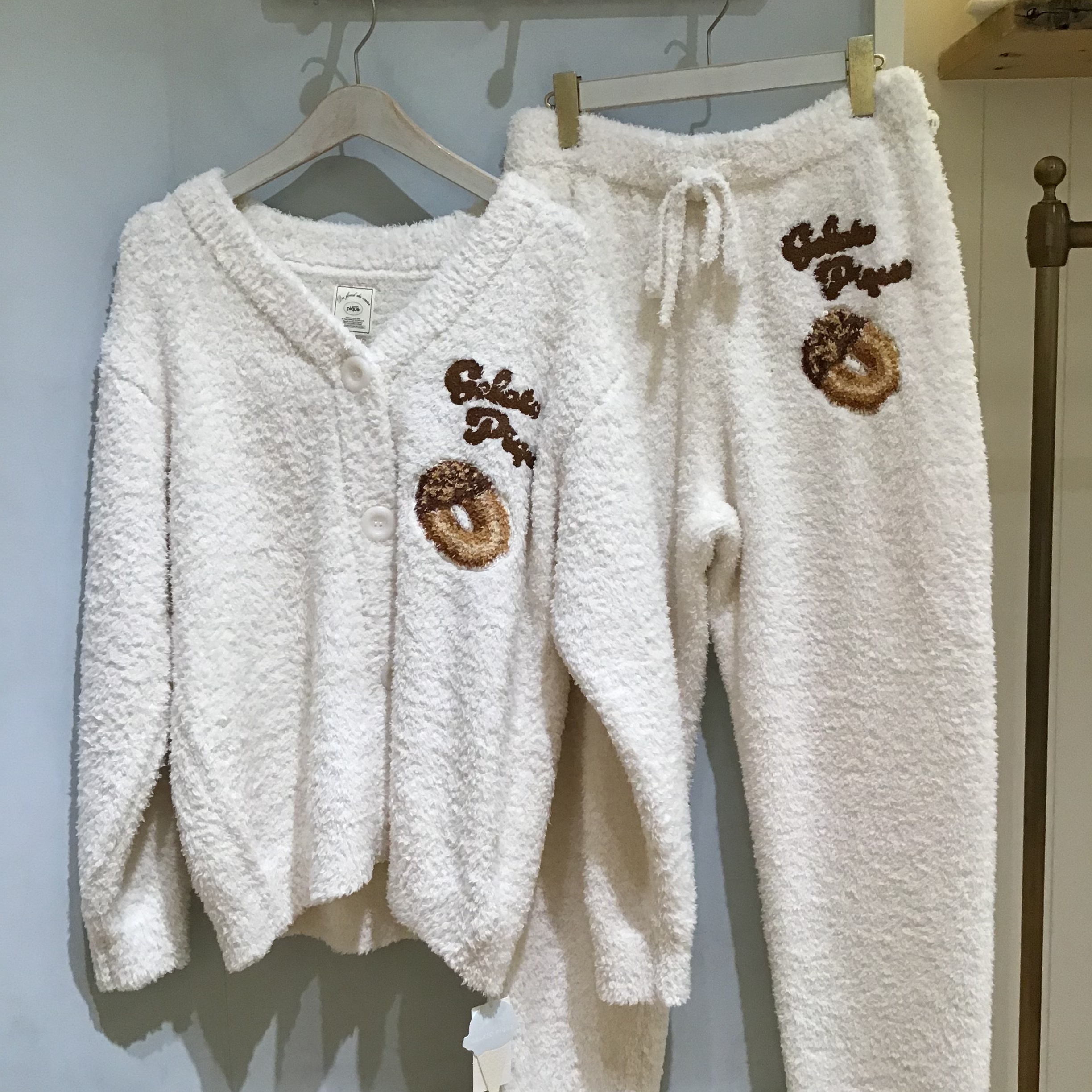 温もりたっぷりのもこもこ素材を使用したロングパンツは、左腰にドーナツのジャガードとサガラ刺繍のロゴをデザイン。裾を絞った太すぎないシルエットは、家事をする時にも動きやすいのがポイントです。色はクリームとピンク、ネイビーの3色展開で、カラーごとに異なるフレーバーのドーナツを描いています。同シリーズのプルオーバーやカーディガンに合わせたり、同時期に展開するドーナツ柄カットソーシリーズとのコーディネートもおすすめです。