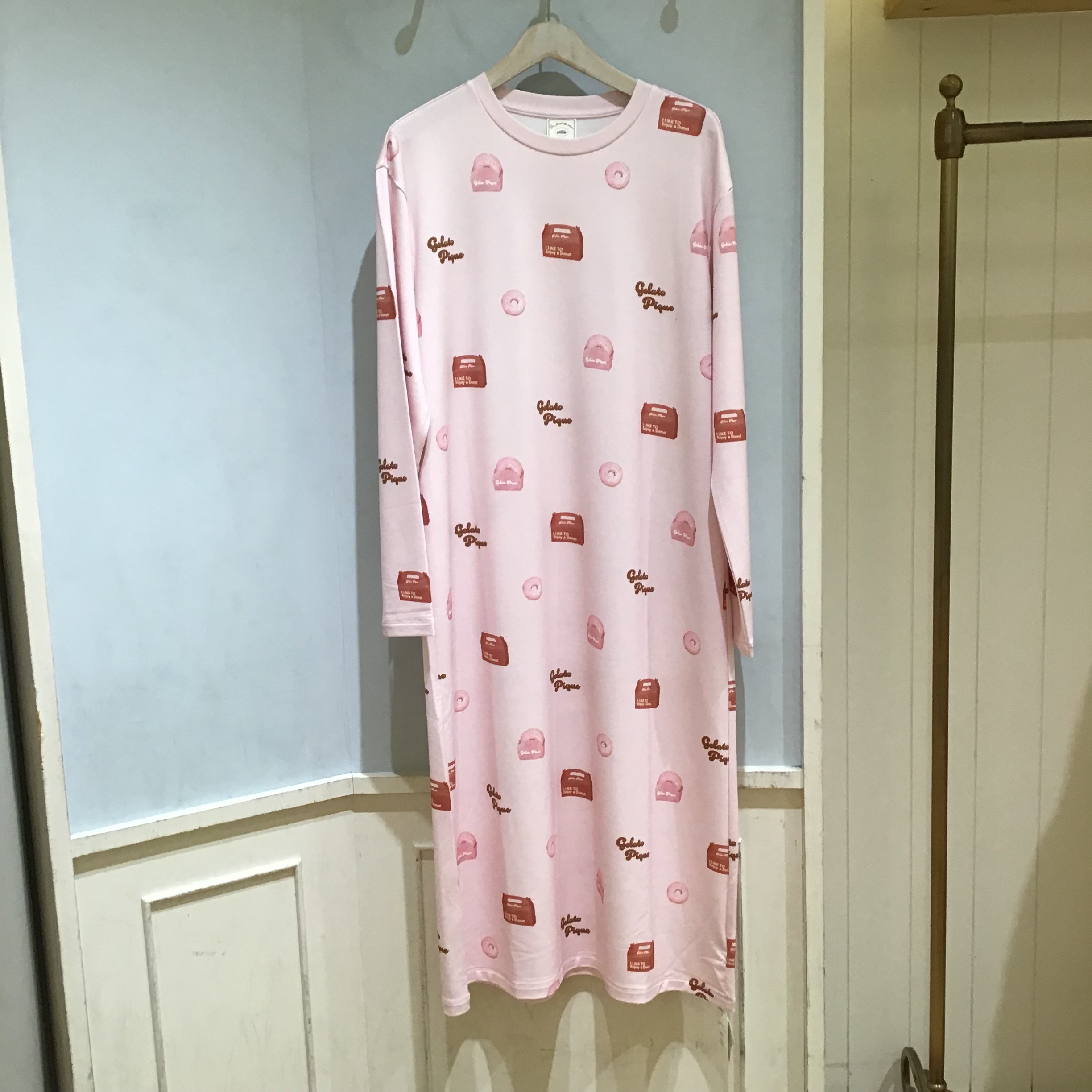 リングドーナツやドーナツの箱、ぷっくりとしたブランドロゴなどを組み合わせた、美味しそうな総柄プリントのワンピース。1枚でさらっと着用していただけるベーシックなシルエットになっています。カラーはクリームとピンクの2色展開。色ごとに異なるフレーバーのドーナツを描いています。同シリーズのドーナツ柄ロングパンツと合わせたり、ドーナツジャガードシリーズとのコーディネートもお楽しみください。