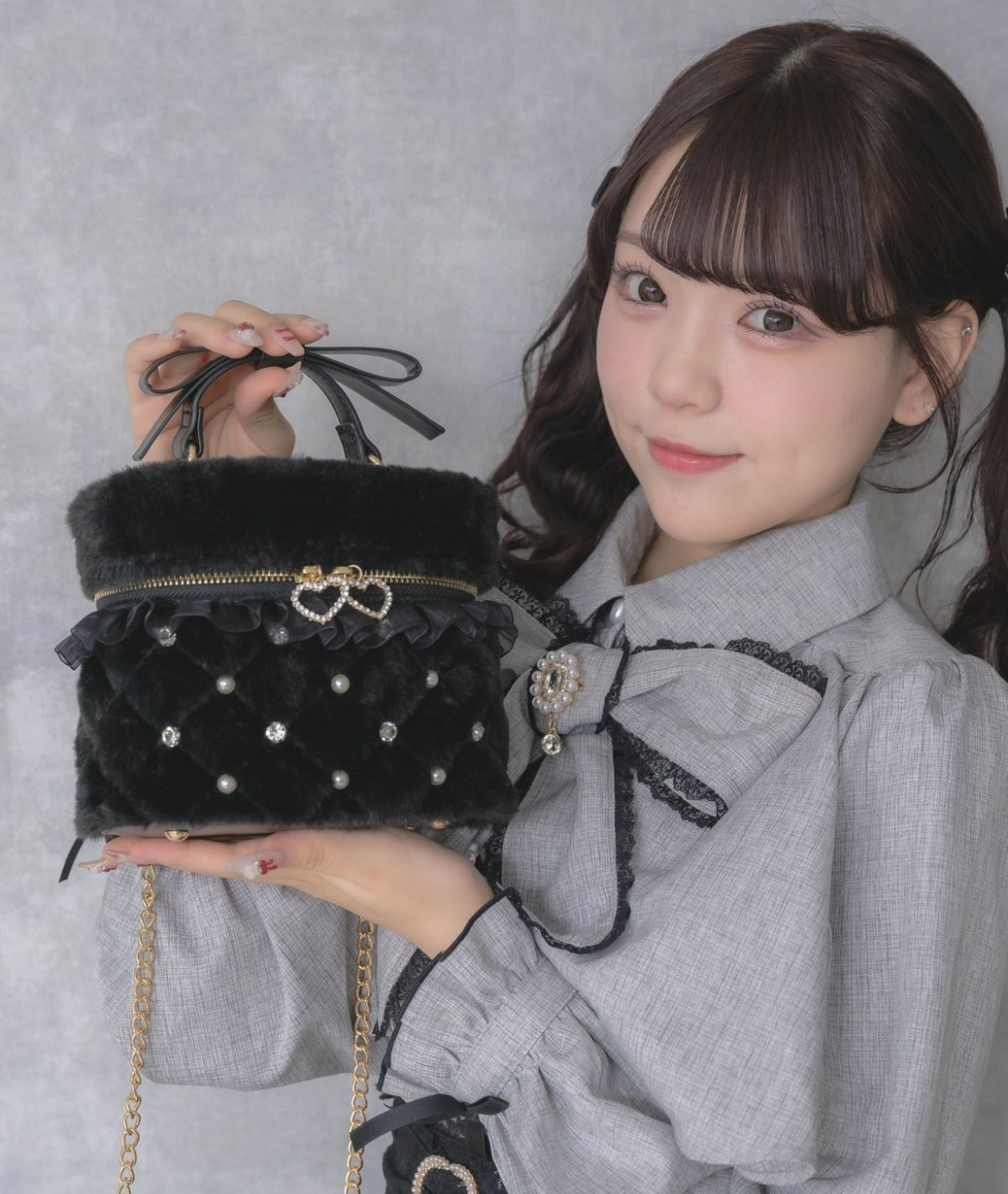 シーズンムード高まるファー素材に、キルティングステッチを組み合わせた上品なバニティバッグ。キルティングにはパールとビジューをランダムにあしらい、光を受けてさりげなくきらめく華やかなデザインに仕上げました♪内ポケット付きで使い勝手も良く、見た目以上の収納力◎