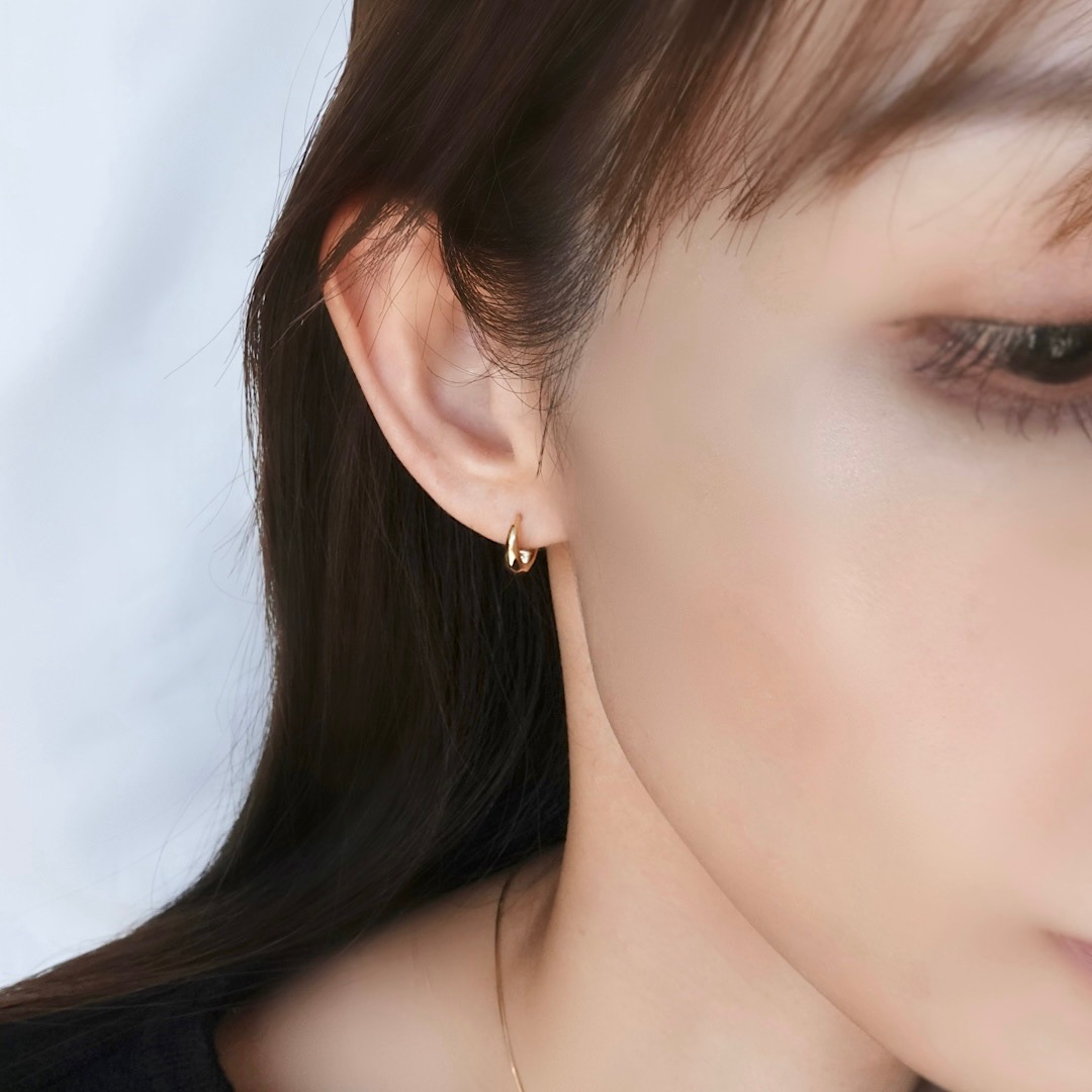 キャッチ不要のワンタッチタイプ。 耳に沿うような小ぶりなサイズ感でデイリー使いにぴったり。 表面のカッティングがポイントに。