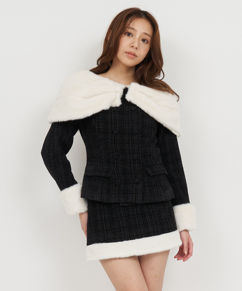 ふわりと添えられたファーがリボンのように見える、遊び心あるデザインが目を惹くツイードジャケットです。