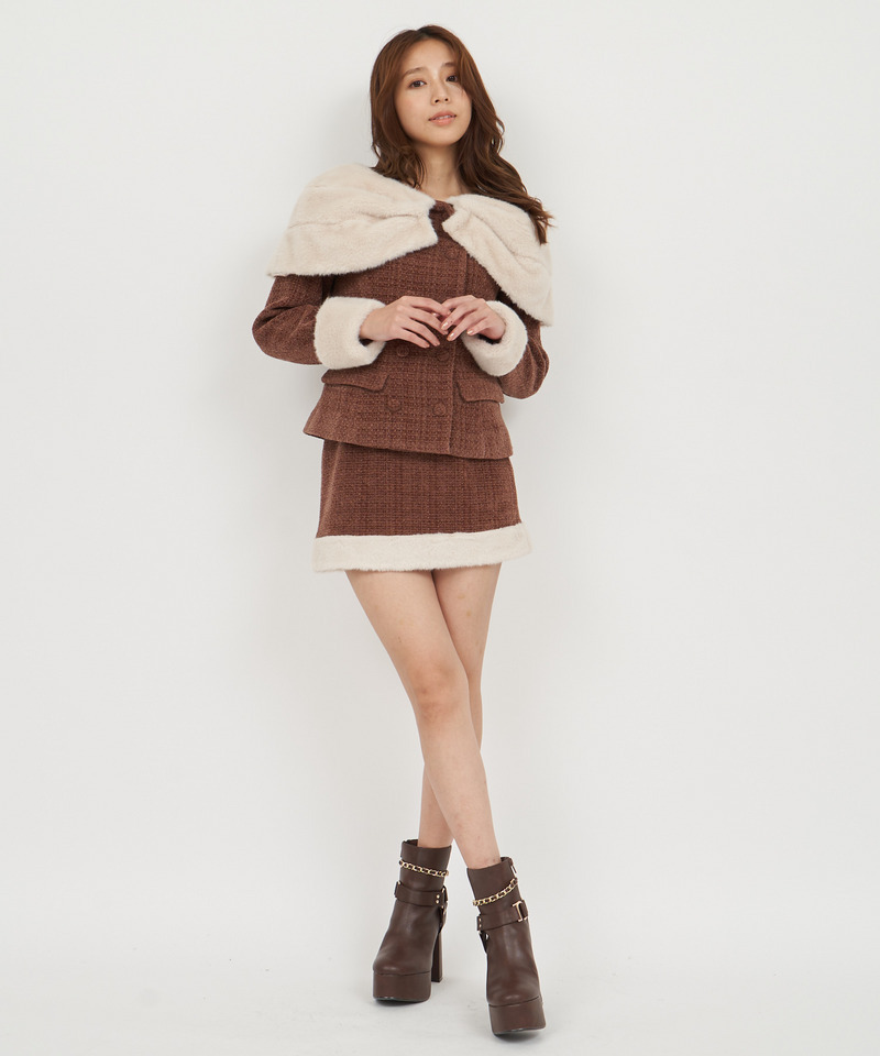 クラシカルなツイード素材に、ふわりとしたファーを裾にあしらったミニスカート。