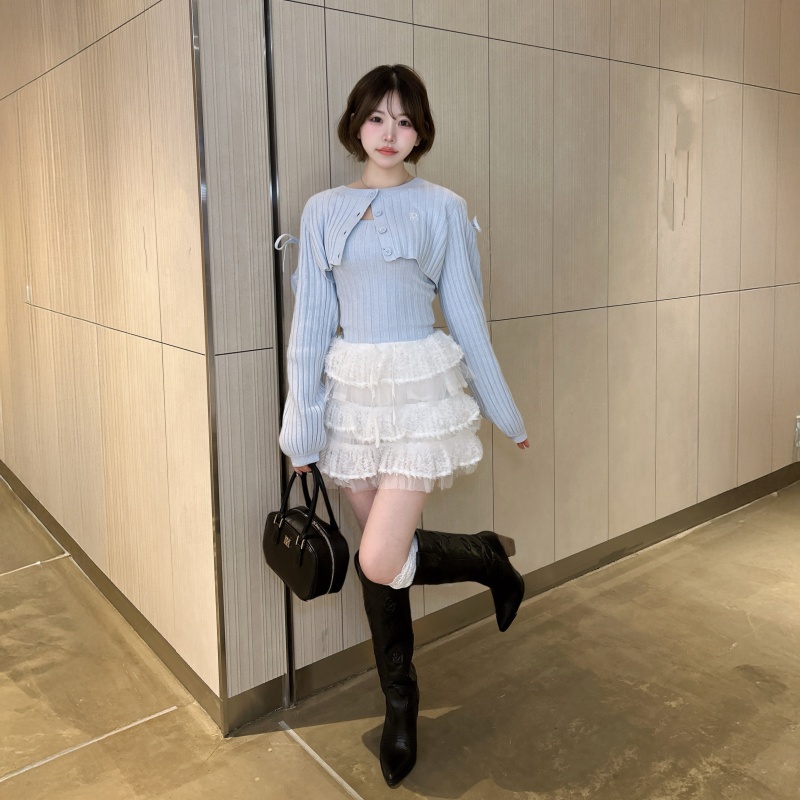 太めリブのキャミ×ショートカーデのセットは、肩スリットとリボンが可愛い旬デザインで着るだけでこなれ感UP✨