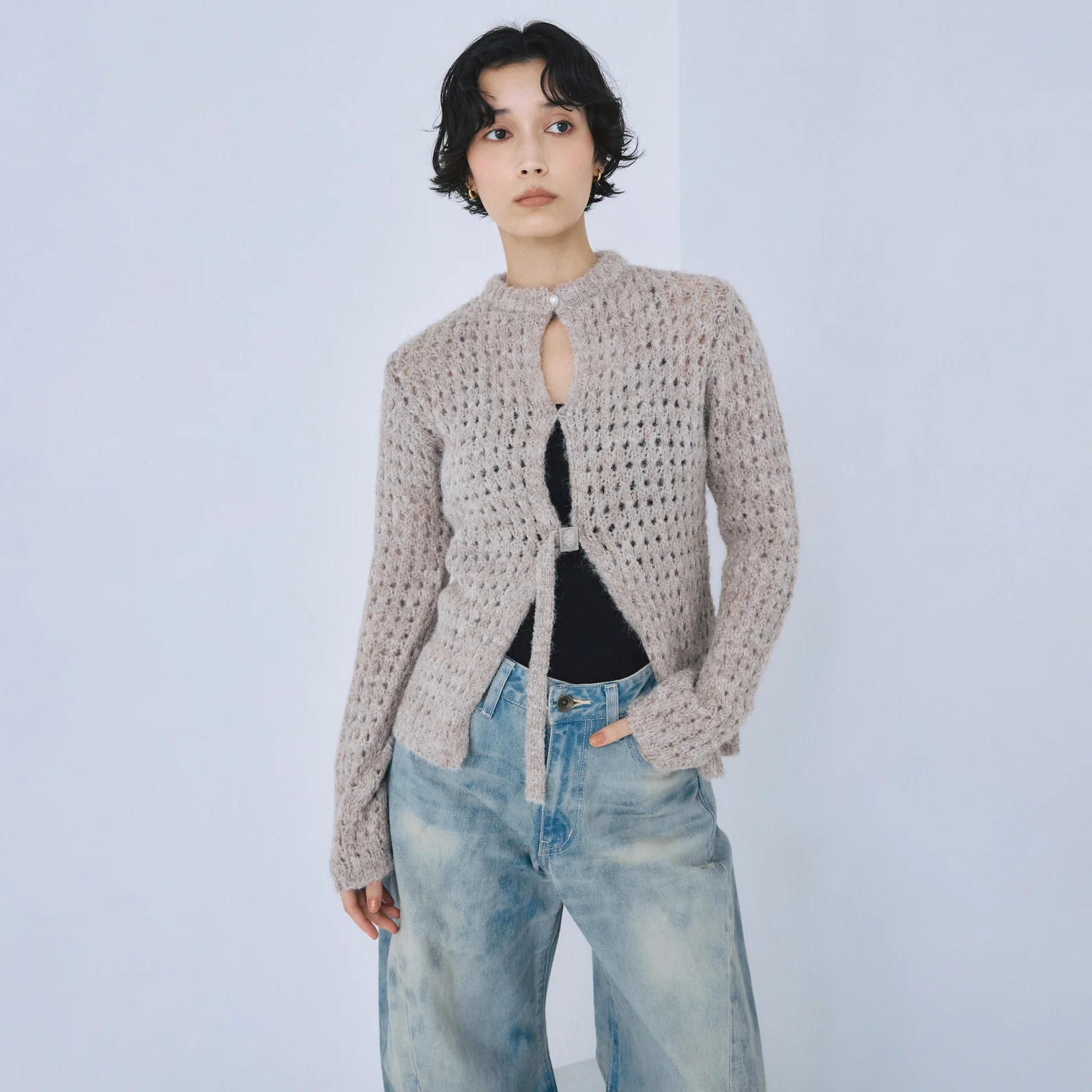 温かみのあるウール混の糸を採用。毛足のあるふんわりとした糸と柔らかなタッチが特徴の1枚。メッシュ編みにすることで、程よい抜け感と立体的な風合いが生まれ、軽やかな着心地に仕上がりました。