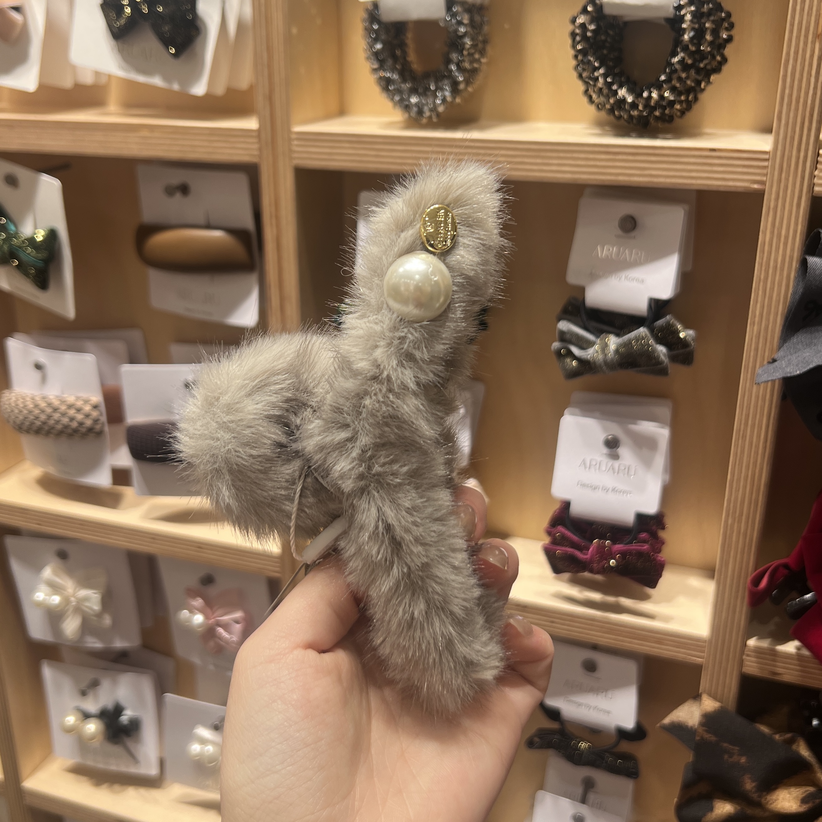ふわふわのファー素材に、上品なパールとゴールドパーツをあしらったバンスクリップです!!