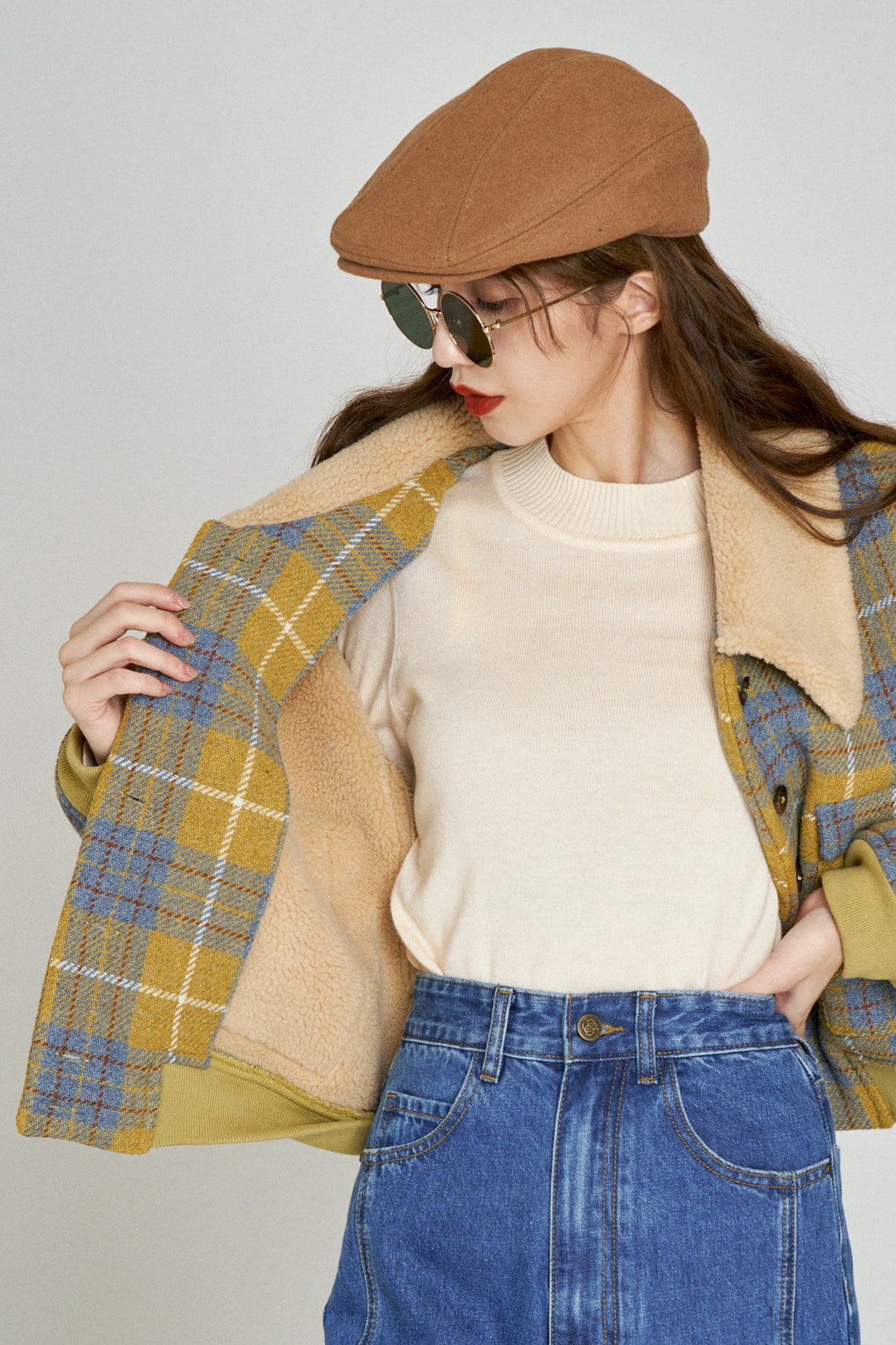 柔らかな色味のチェックがかわいいボアカラーのジャケットアウターです🐑