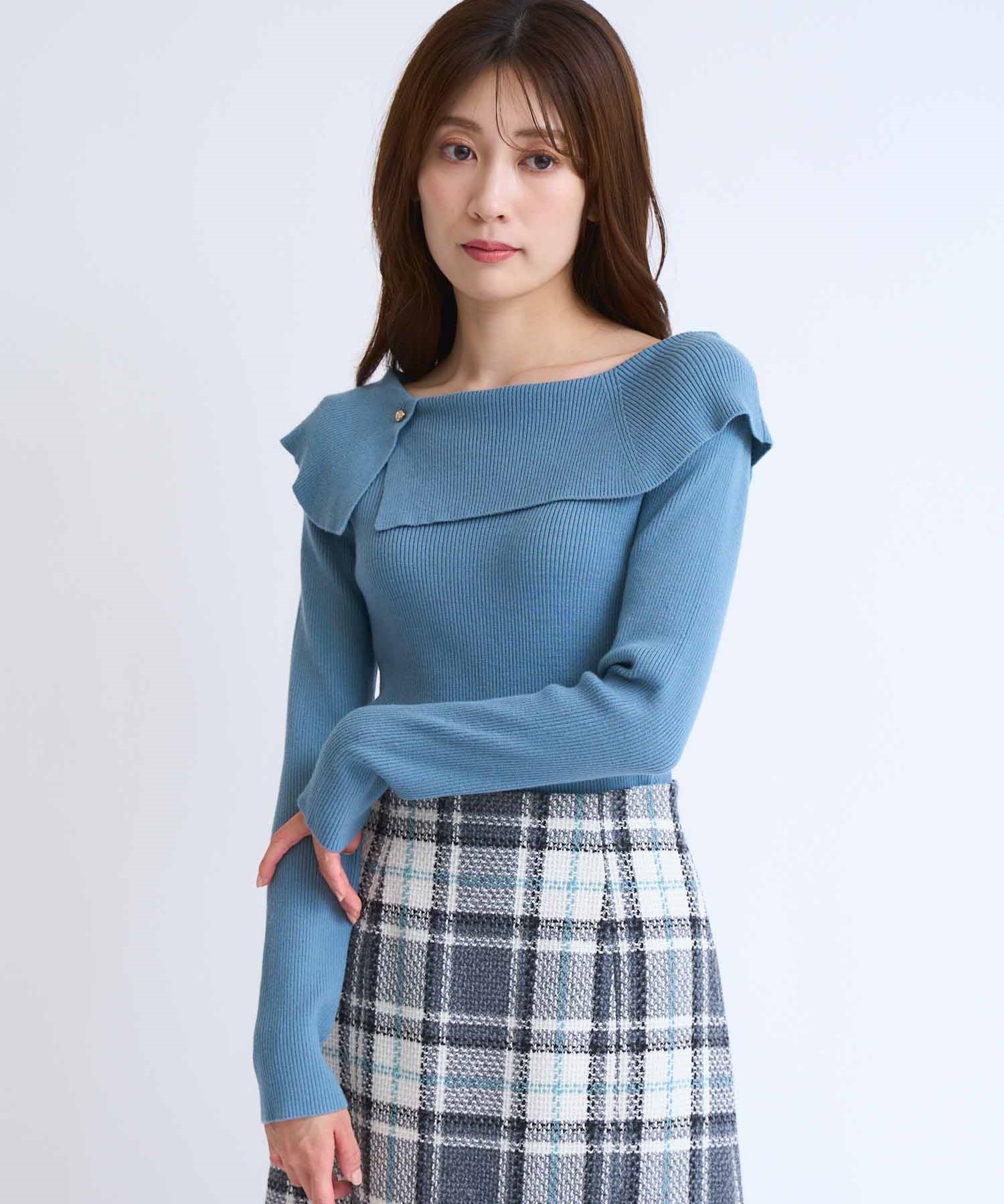 アシンメトリーなケープデザインが印象的なリブニットトップス。