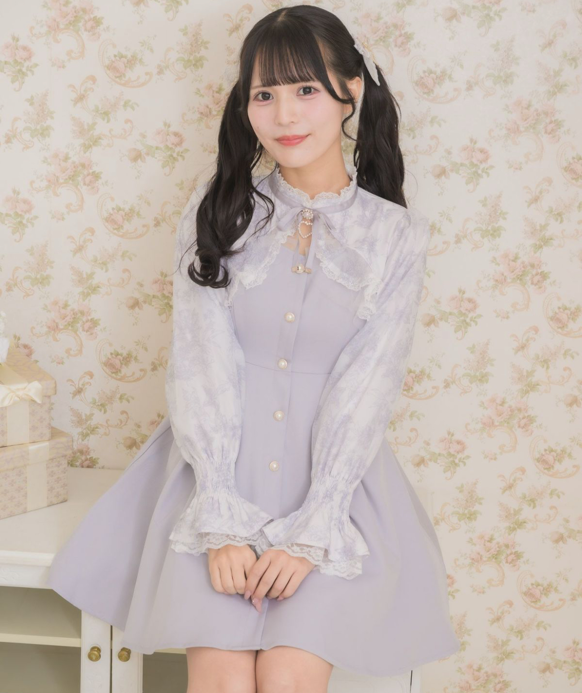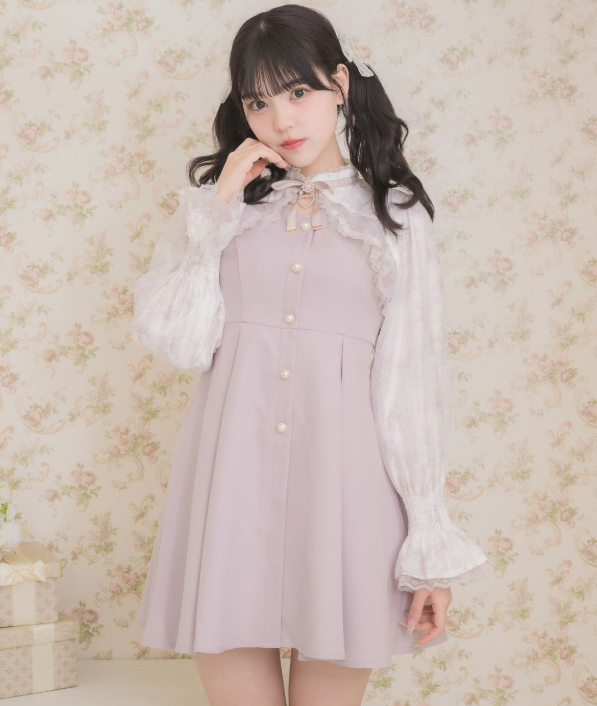 ポンチョを羽織ったような切り替えデザイン♪繊細な花柄プリントがエレガントな雰囲気を纏ってくれます。旬の着こなしが完成するシアースリーブで、優しげな印象をアップデート♡ネックリボンについたハートのチャームが可愛いポイントです。