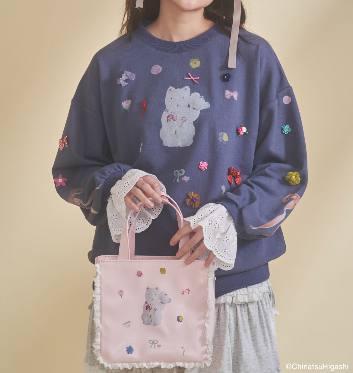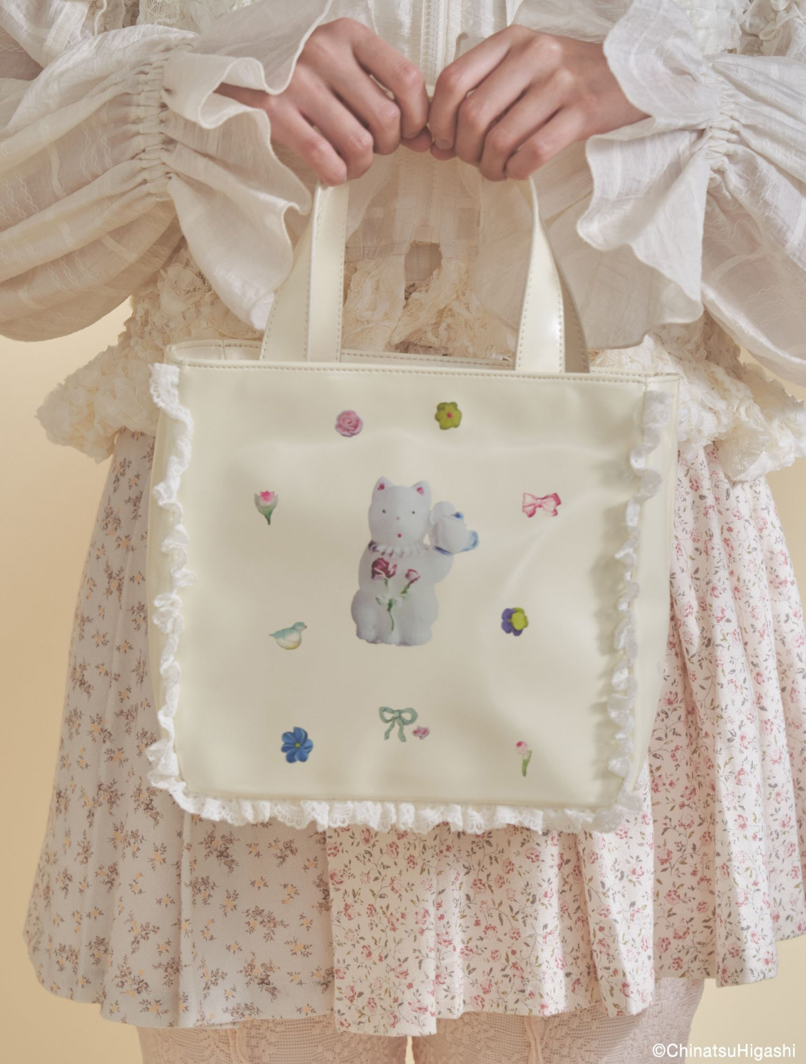 光沢感のある合皮素材に、シュガーキャットと愛らしいモチーフをふわっと散りばめたbag。