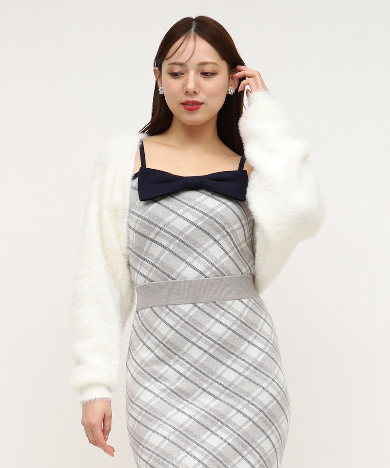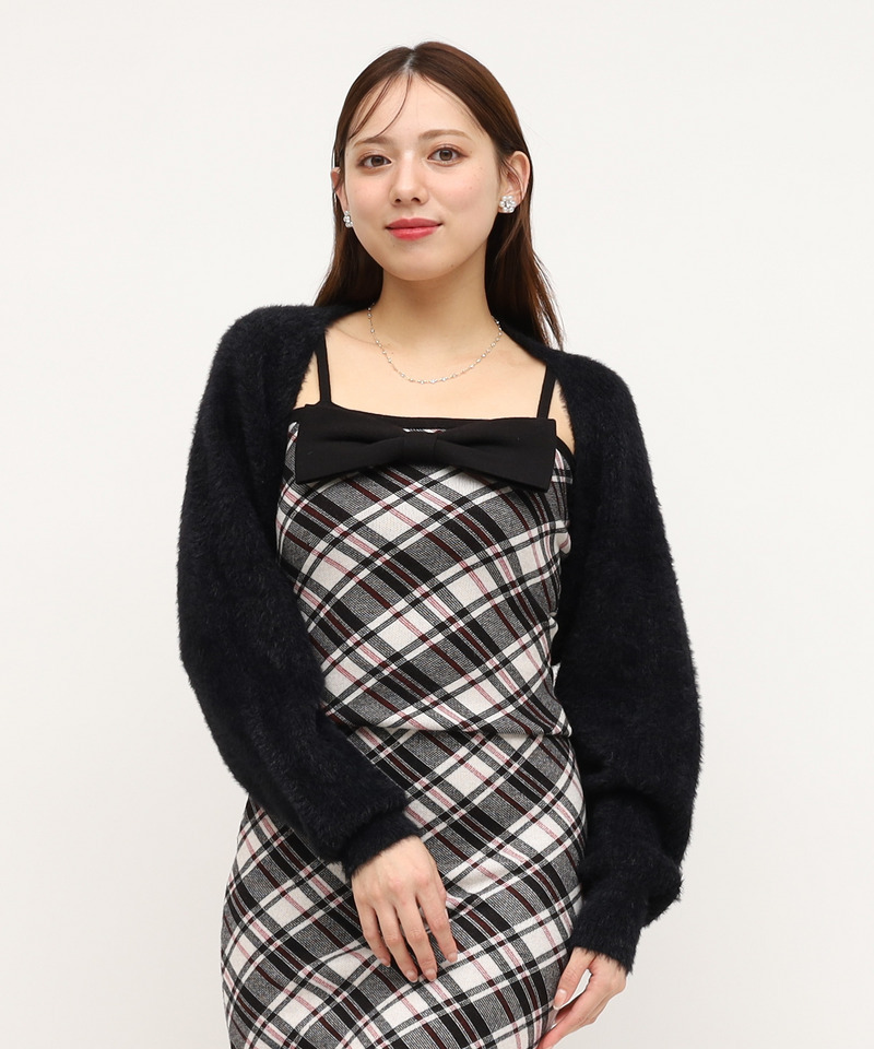 ジャガード編みで表現したチェック柄が目を惹くニットキャミソール×冬ムードを高めるシャギーボレロのアンサンブル。