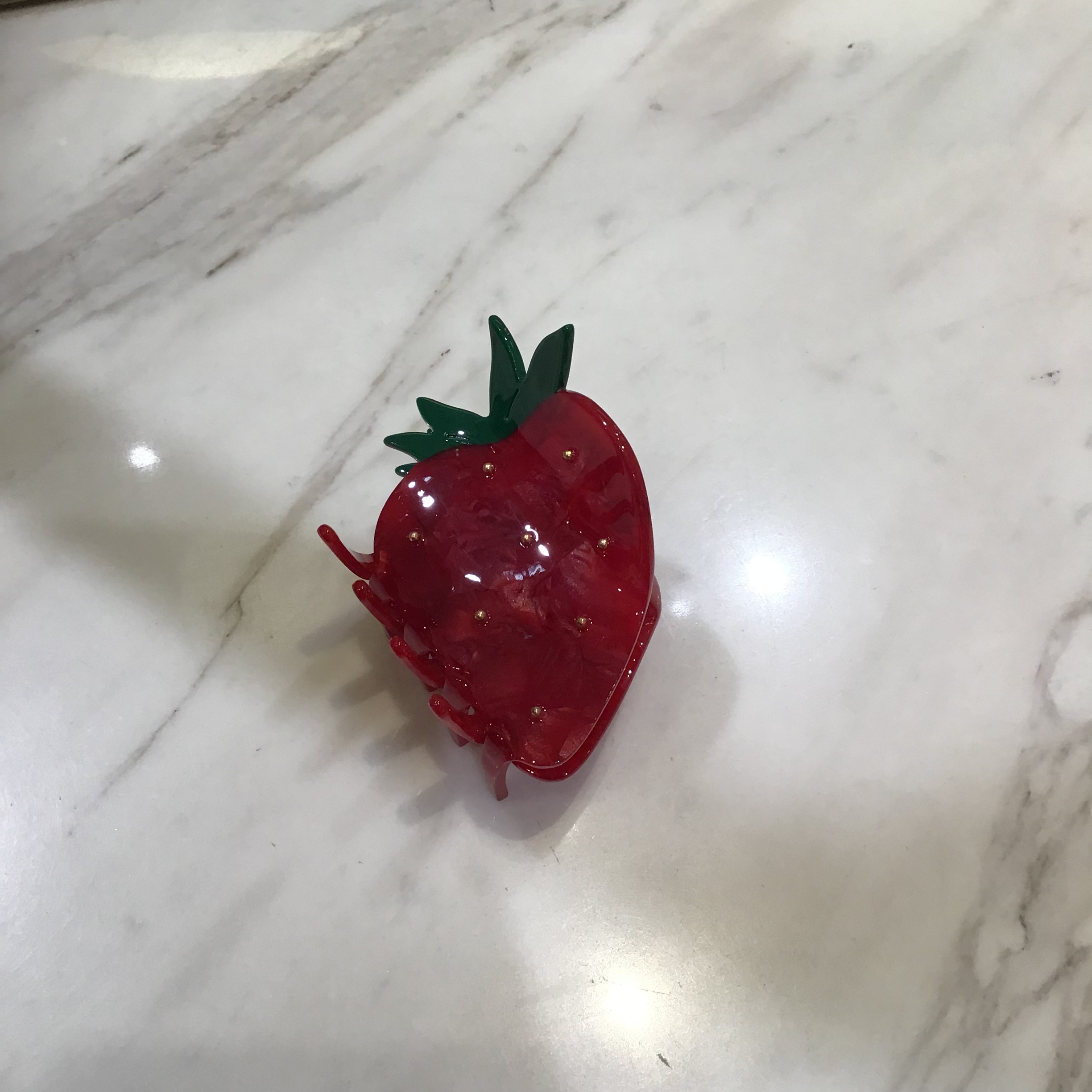 ストロベリーのつぶつぶをゴールドのパーツで表現した、アセチ素材のヘアクリップ🍓ジューシーな質感の生地と、葉っぱの部分までリアルな形にこだわりました🍃ハーフアップにちょうど良い大きさなので、ボブからロングまで幅広いレングスの方にご使用いただけます。同シリーズの小物やルームウェアと組み合わせてお楽しみください✨