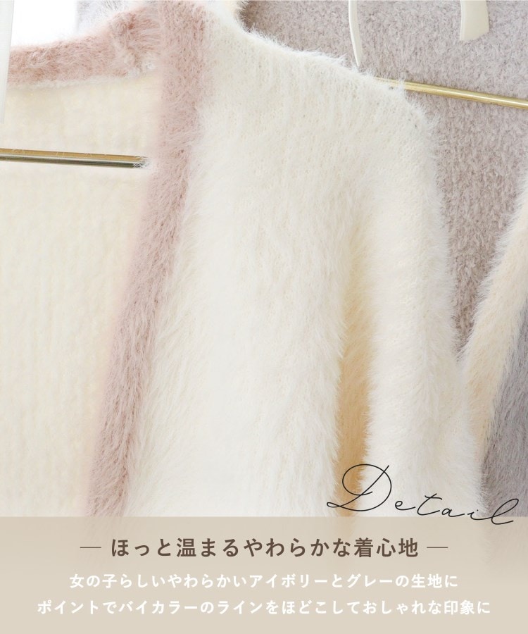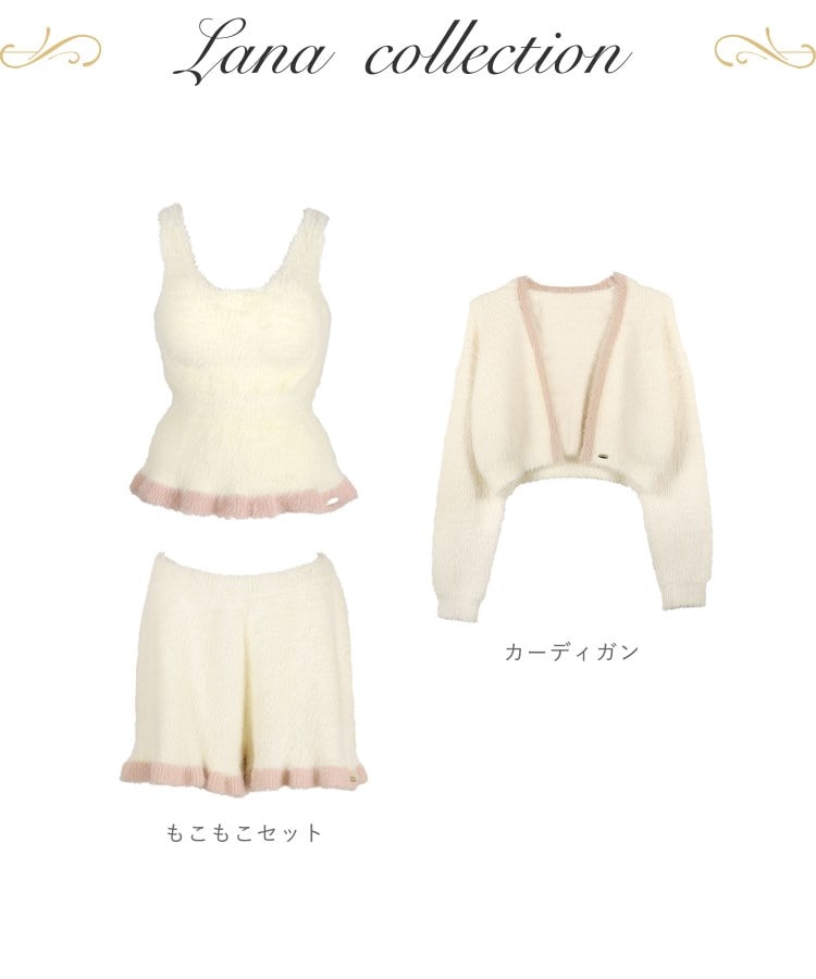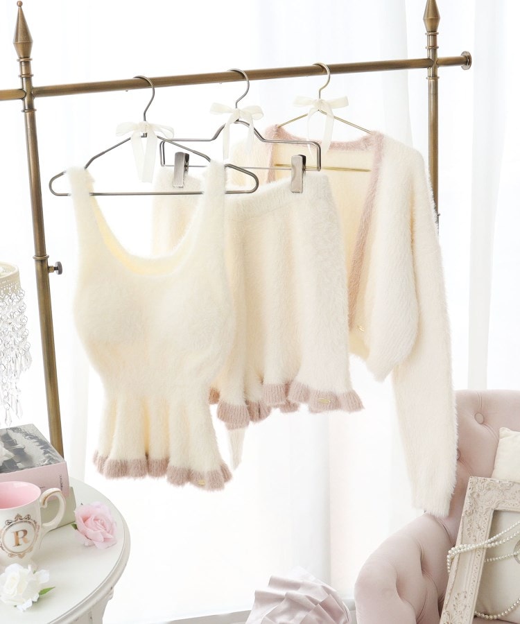 毛足が長めのファーニットを使用した、リサマリのルームウェアシリーズです。女の子らしいやわらかいアイボリーとグレーの生地に、ポイントでバイカラーのラインをほどこしておしゃれな印象に。トップスとボトムスの裾はフリル調にすることで、可愛らしいフレアシルエットを演出します。裾部分にはさりげなくリサマリロゴチャームをあしらいました。トップスはカップ付きなので、これ1枚でご着用いただけます。カップ下はリブ仕様にすることで、バストのフィット感にもこだわりました。ほっと温まりたくなる、おうちでのリラックスタイムにおすすめしたいアイテムです。