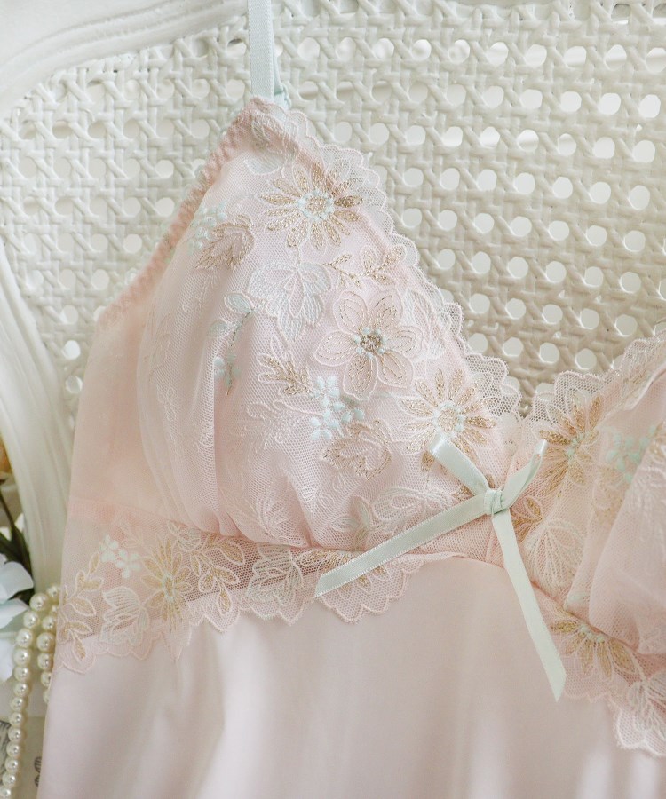 きらめくマーガレットのお花をモチーフにしたシリーズです。カップレースからカップ下部分には、線で描いたようなステッチでマーガレットや草花を刺繍して、キラキラとほのかに輝くラメ糸が、素朴な可愛らしさを演出。ポイントで温かみのあるウーリー糸をあしらうことで、やわらかくフェミニンな印象に仕上がりました。カップレースにはお花のアップリケを重ねて、さりげない立体感を表現しています。裾にはリボンとV字でストレッチレースをほどこし、可愛らしさを後押ししながらも、上品な肌見せスタイルをお楽しみいただけます。日常にそっと寄り添ってくれるような、小さなときめきを詰め込んだコレクションです。
